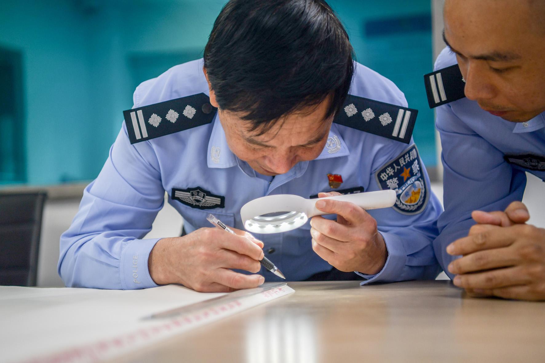 圖為10月11日,民警對假冒本土著名品牌宣紙的紋理、印刷、包裝工藝進行勘驗。