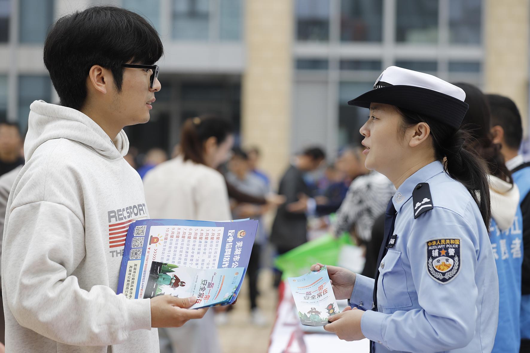 10月15日,安徽省蕪湖市公安局交警支隊鳩江大隊民警輔警走進蕪湖學院,向2024級新生宣傳“一盔一帶”、反詐等知識。