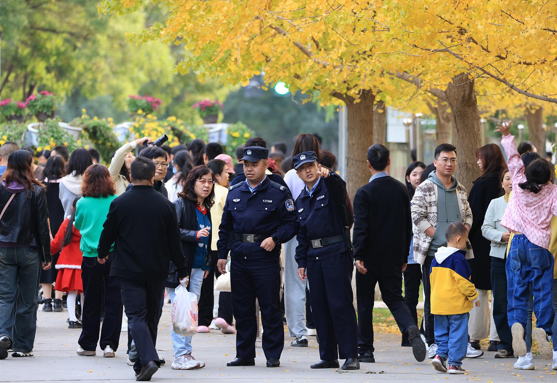 圖為10月20日,民警輔警在植物園巡邏,服務(wù)游客。