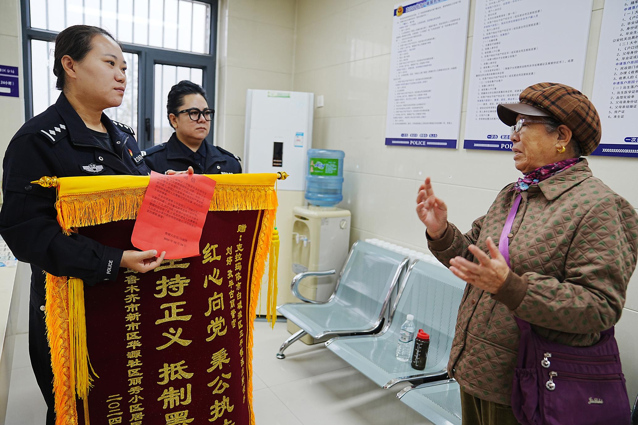10月29日,新疆維吾爾自治區(qū)烏魯木齊市馬女士跨越300公里專程來到克拉瑪依市公安局三平鎮(zhèn)派出所,將一面錦旗贈給民警,感謝民警幫助其解決了兒子長期沒有的戶口問題。