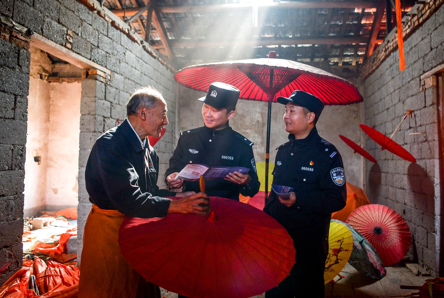 為護(hù)航非物質(zhì)文化遺產(chǎn)健康發(fā)展,11月4日,安徽省涇縣公安局昌橋派出所民警來(lái)到昌橋鄉(xiāng)孤峰油紙傘廠,開展“嘮家常 話安全”活動(dòng)。