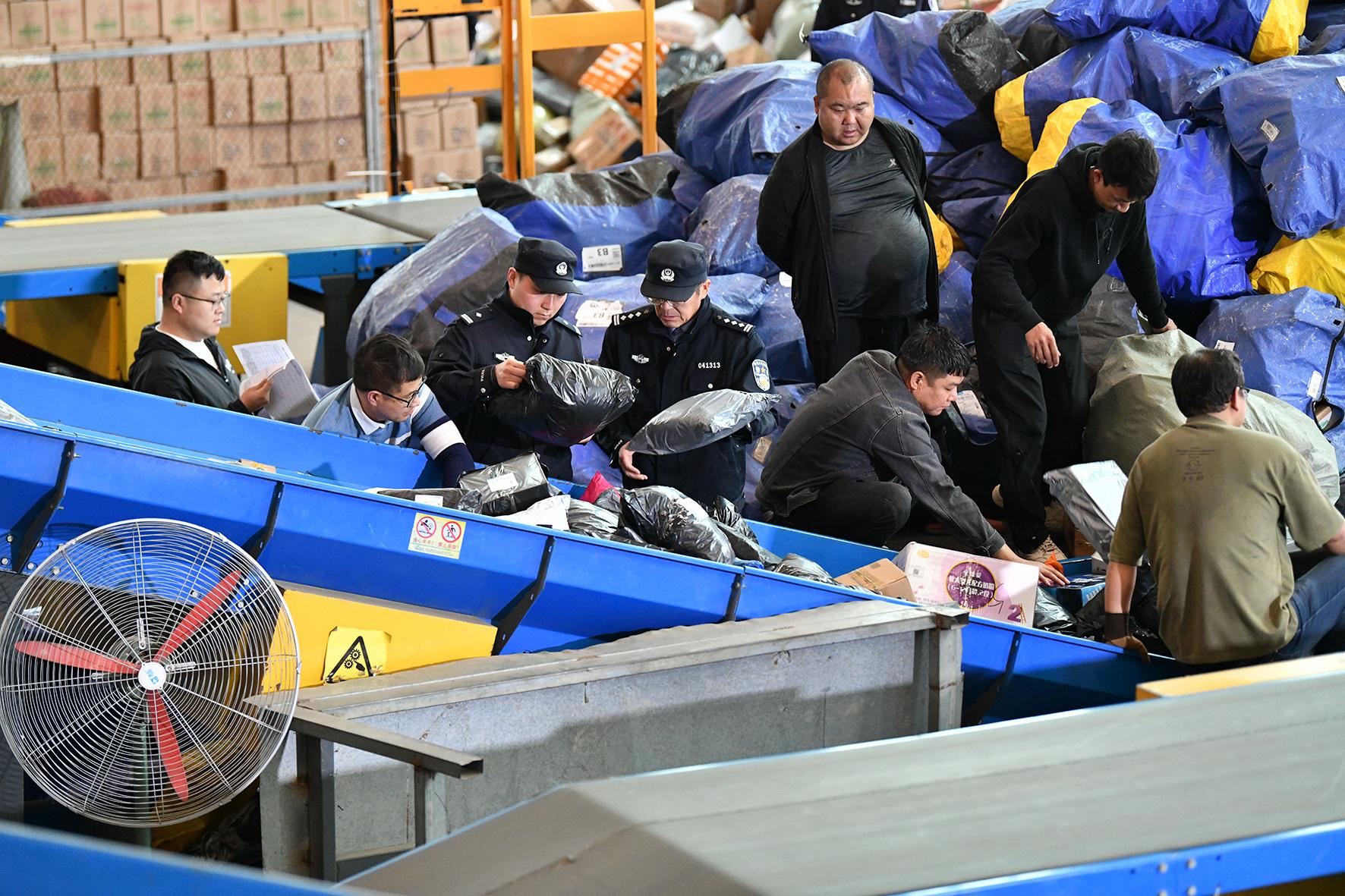 11月4日,安徽省阜南縣公安局經(jīng)開區(qū)派出所民警在一快遞物流分揀中心進(jìn)行安全檢查。隨著“雙十一”臨近,阜南縣公安局經(jīng)濟(jì)開發(fā)區(qū)派出所組織警力對(duì)轄區(qū)物流寄遞業(yè)的寄遞包裹實(shí)名登記、辦公場所的公共視頻及消防措施設(shè)置等進(jìn)行安全檢查,消除物流寄遞行業(yè)安全隱患。
