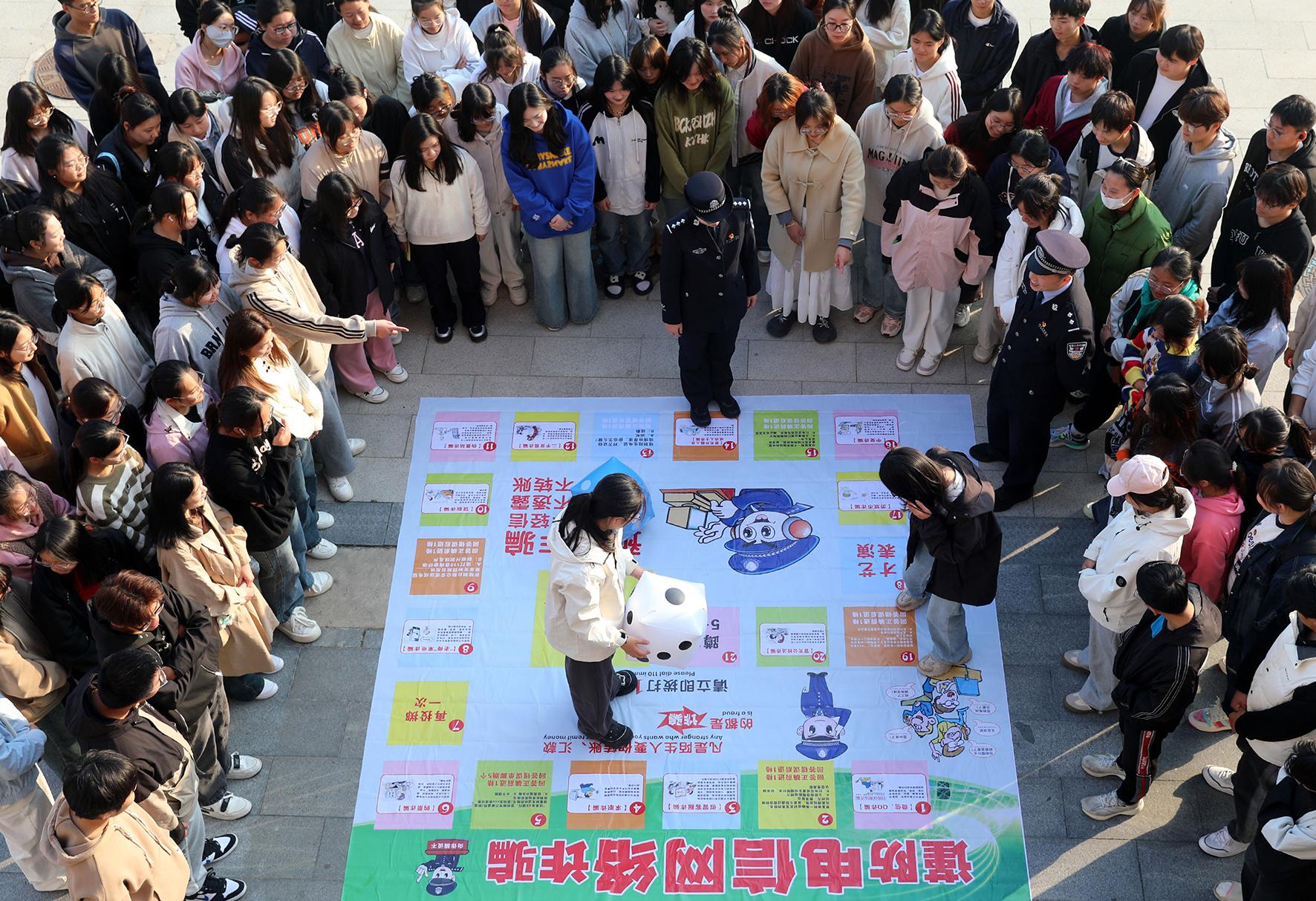 圖為民警組織師生進行“反詐飛行棋”趣味游戲互動。