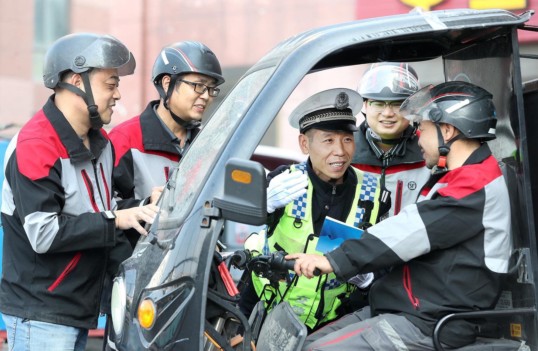 11月11日中午,湖北省荊門市公安局交警支隊(duì)東寶大隊(duì)民警在一家快遞公司,叮囑快遞“小哥”攬件、送件從“頭”做起,保護(hù)好自己以及他人的生命財(cái)產(chǎn)安全。