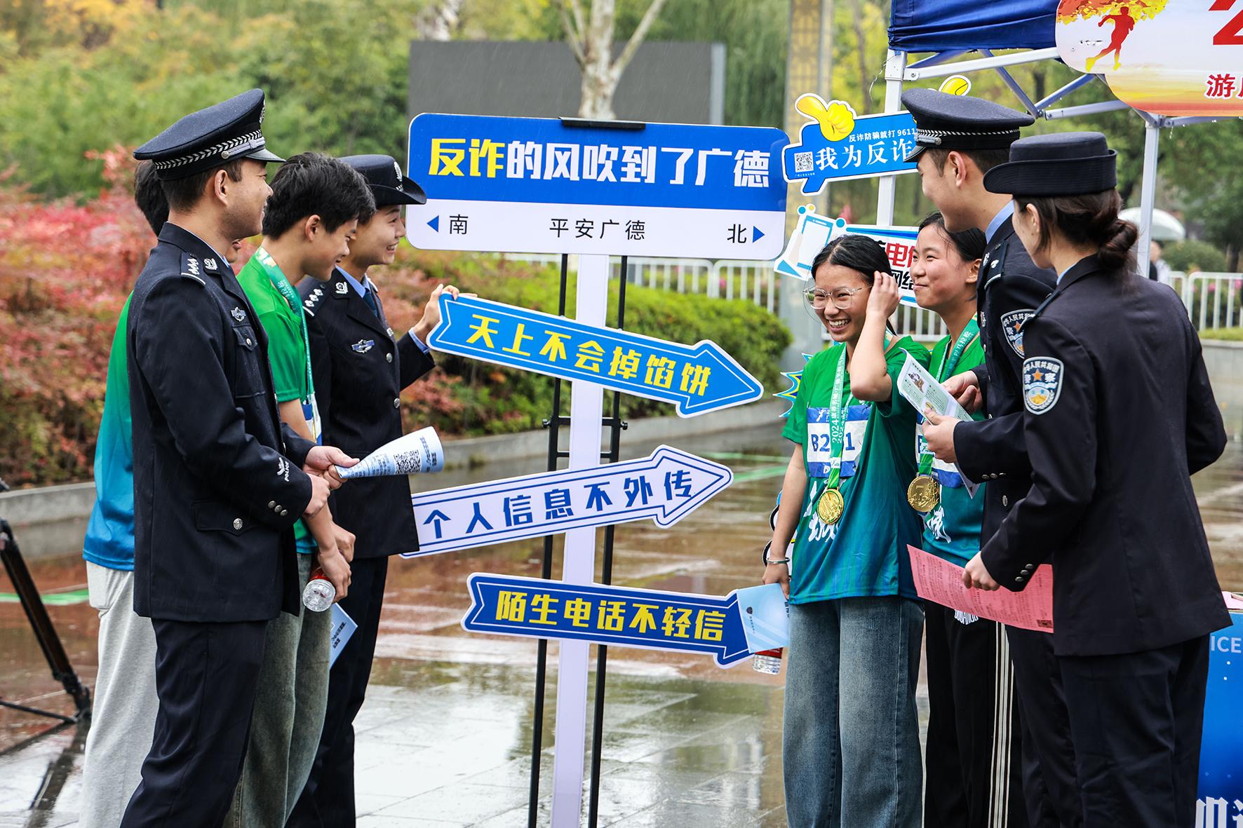 11月17日,安徽省廣德市公安局在馬拉松運(yùn)動(dòng)員完賽區(qū)設(shè)置反詐騙服務(wù)站,開展反詐知識(shí)宣傳。