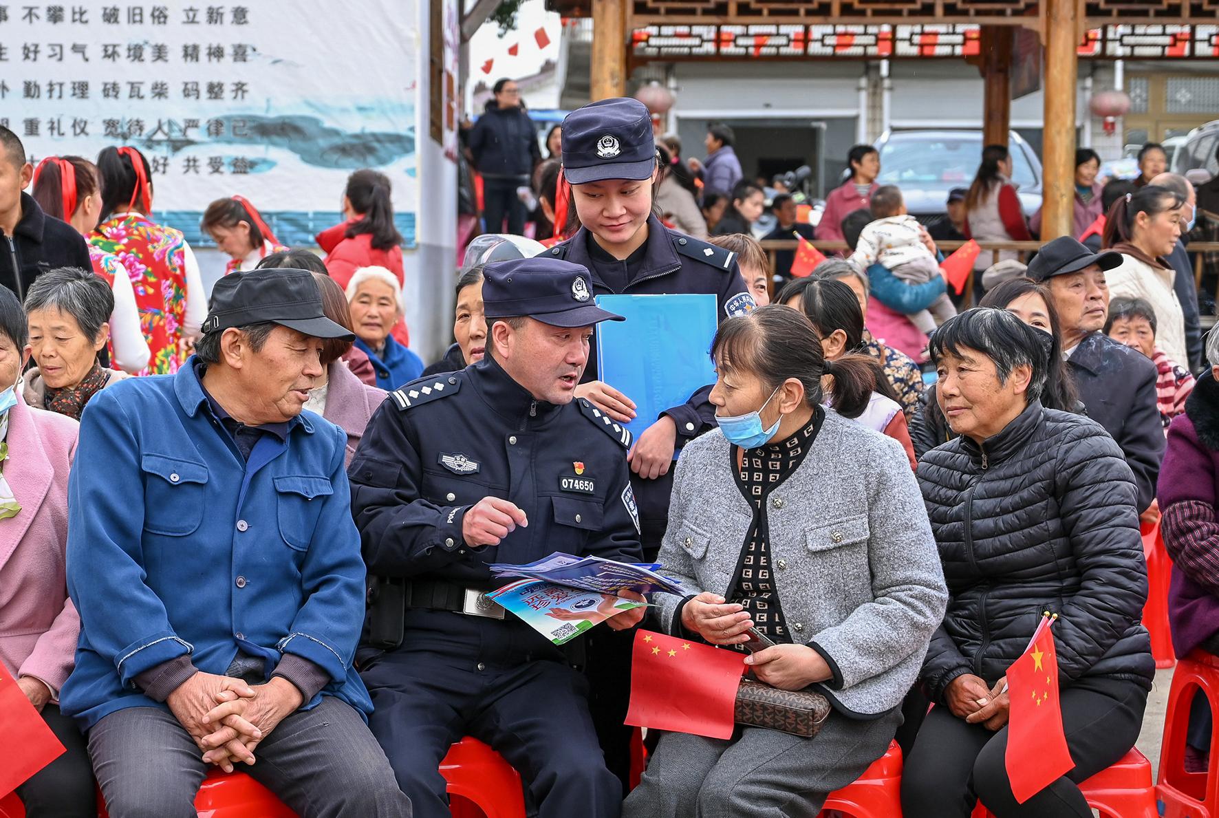 11月18日,在安徽省馬鞍山市和縣石楊鎮(zhèn)“安徽省2024四季村晚”現(xiàn)場(chǎng),石楊派出所民警正在向村民開展普法宣傳,講解網(wǎng)絡(luò)詐騙、禁毒和冬季防盜知識(shí),讓村民在享受精神大餐的同時(shí),提升法治意識(shí)和自我保護(hù)能力。