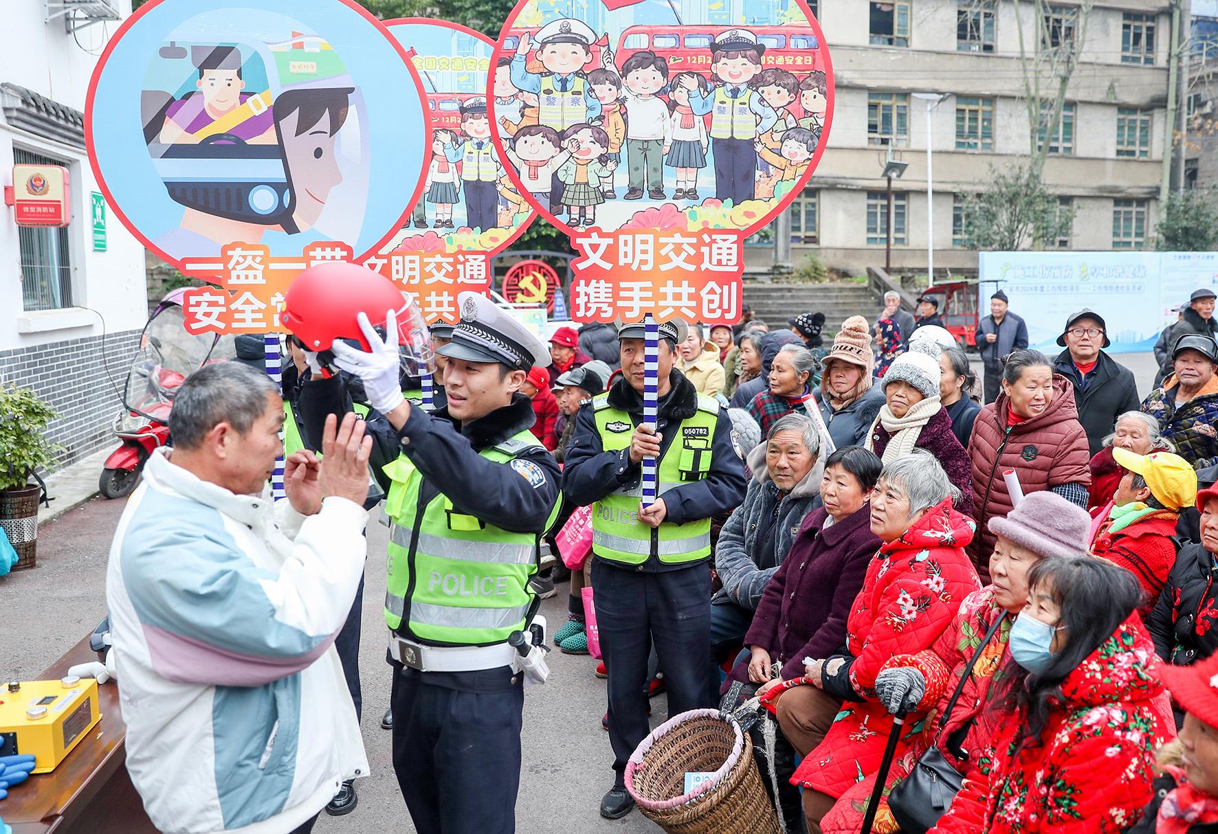 12月23日,四川省華鎣市公安局交通警察大隊(duì)民警在天池鎮(zhèn)華光社區(qū),向居民講解安全頭盔的作用和正確戴法。