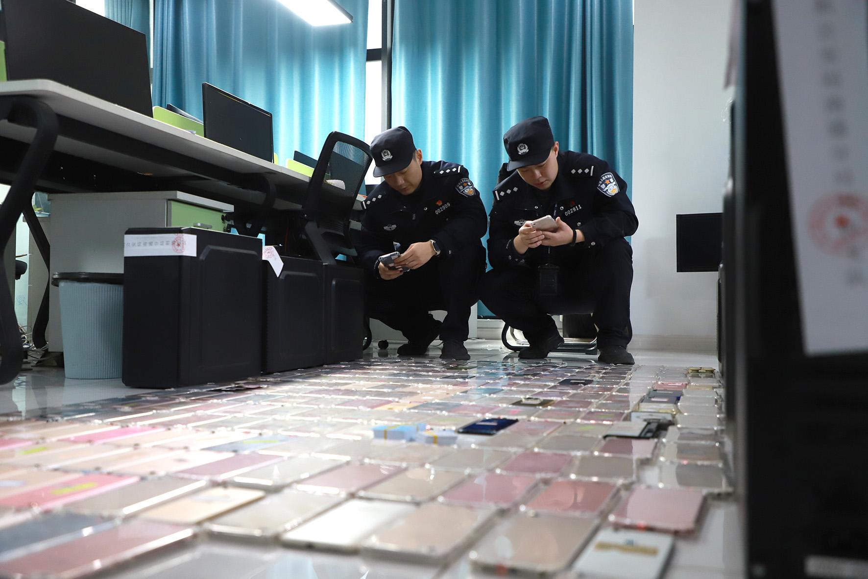 圖為民警對作案所使用的手機、電腦等工具進行扣押、清點。