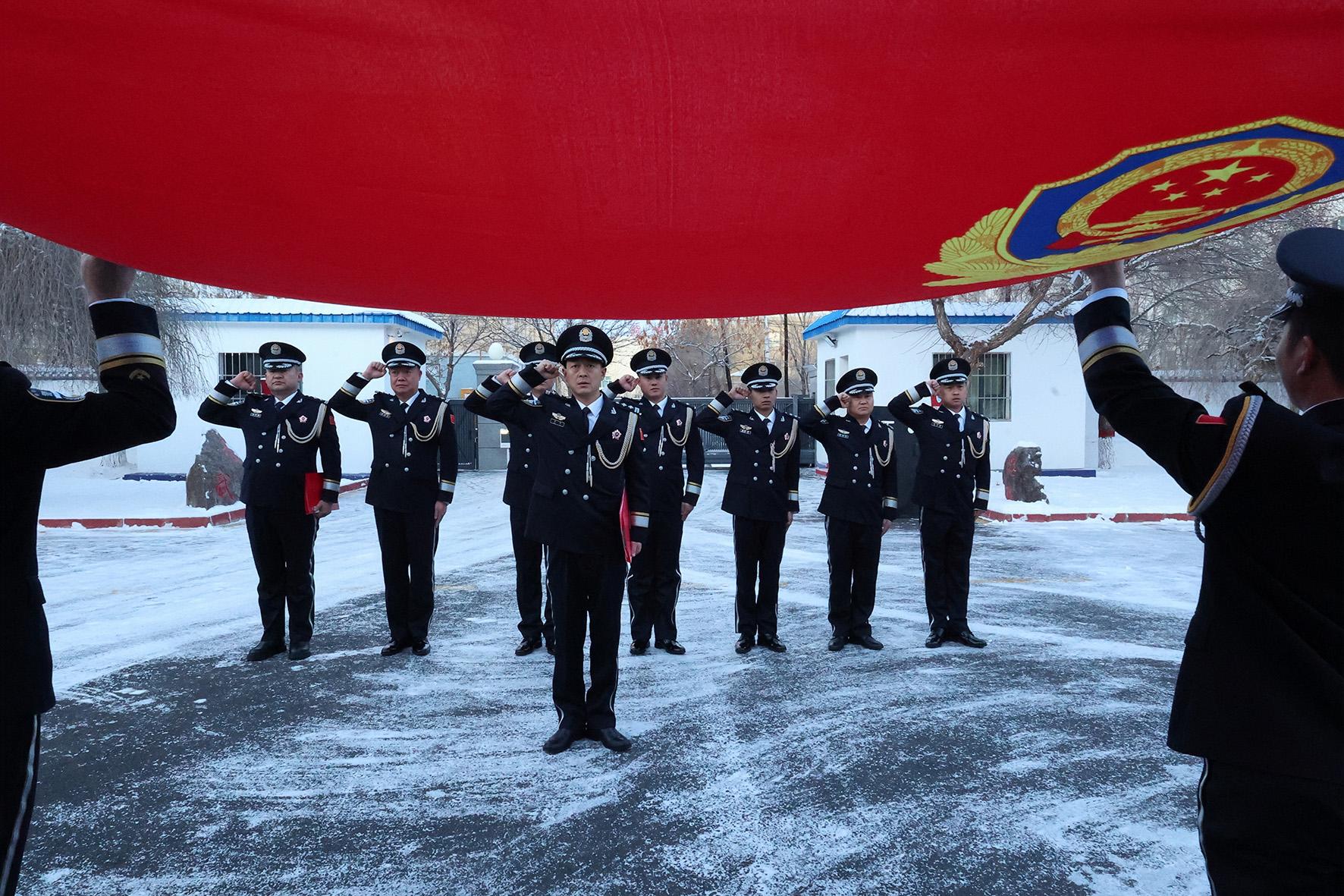 1月10日,新疆阿勒泰吉木乃邊境管理大隊舉行中國人民警察節(jié)升旗及宣誓儀式。
