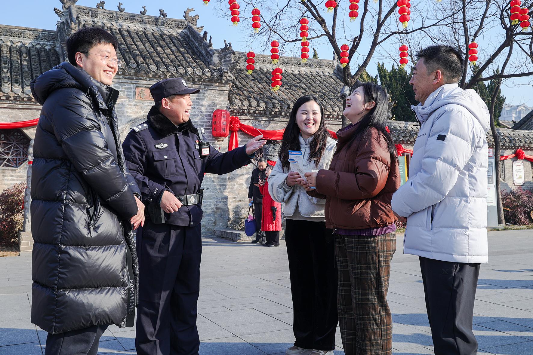 1月29日,安徽省亳州市譙城分局民輔警在華祖庵景區(qū)巡邏執(zhí)勤,開展反詐宣傳,守護游客安全。