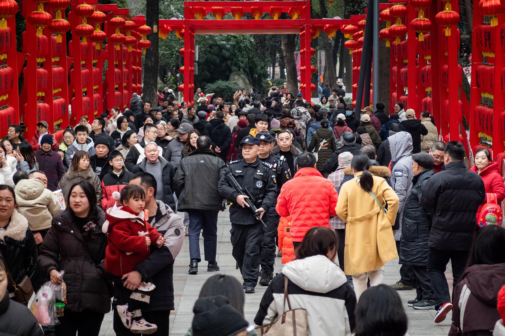 2月1日,四川省綿陽市公安局特巡警支隊機動二大隊民警在人民公園巡邏。