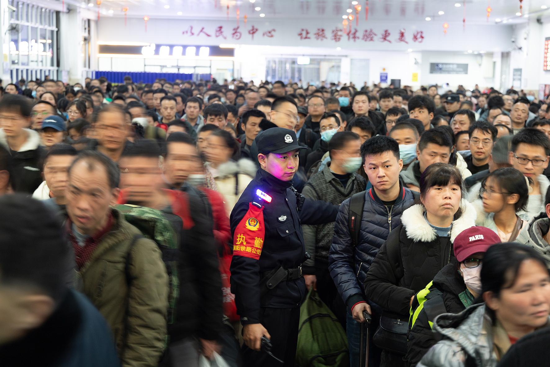2月2日,廣西柳州鐵路公安處融水站派出所執(zhí)勤民警堅守崗位,護送旅客平安出行。