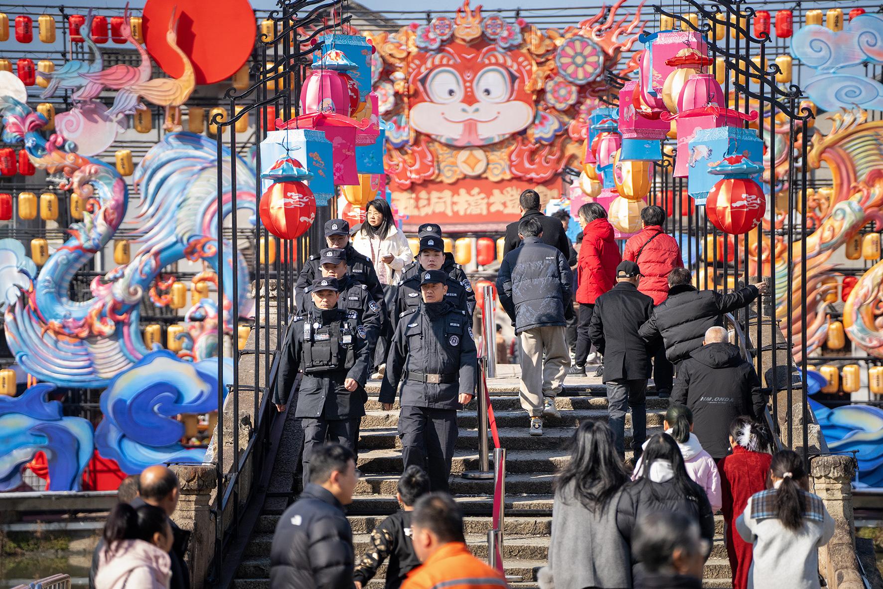 1月29日,大年初一。浙江省臺州市公安局黃巖分局巡特警大隊民警在景區(qū)巡邏。