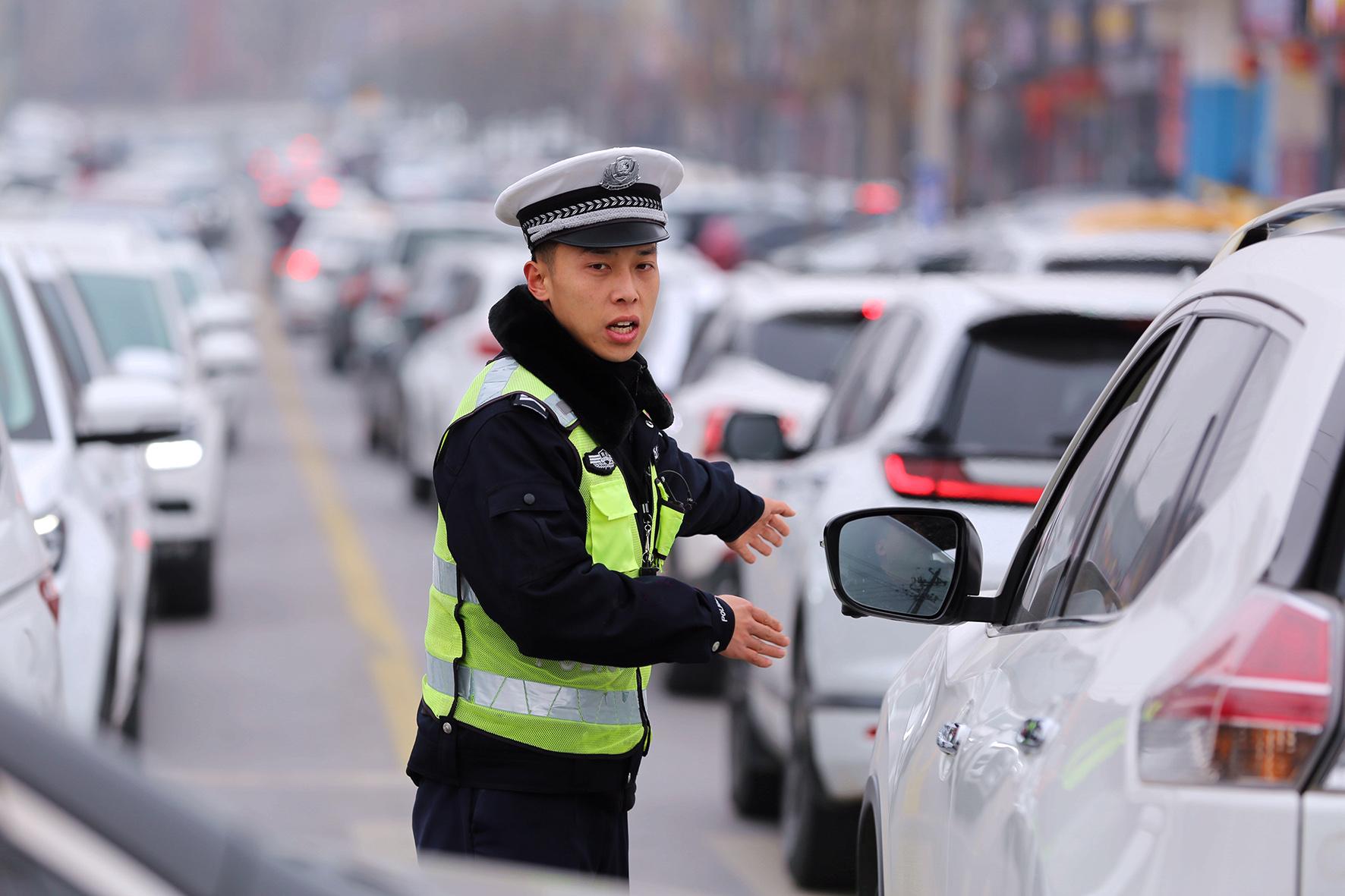 2月1日,陜西省渭南市潼關(guān)縣公安局交警大隊民輔警在景區(qū)主要路段指揮疏導(dǎo)交通。