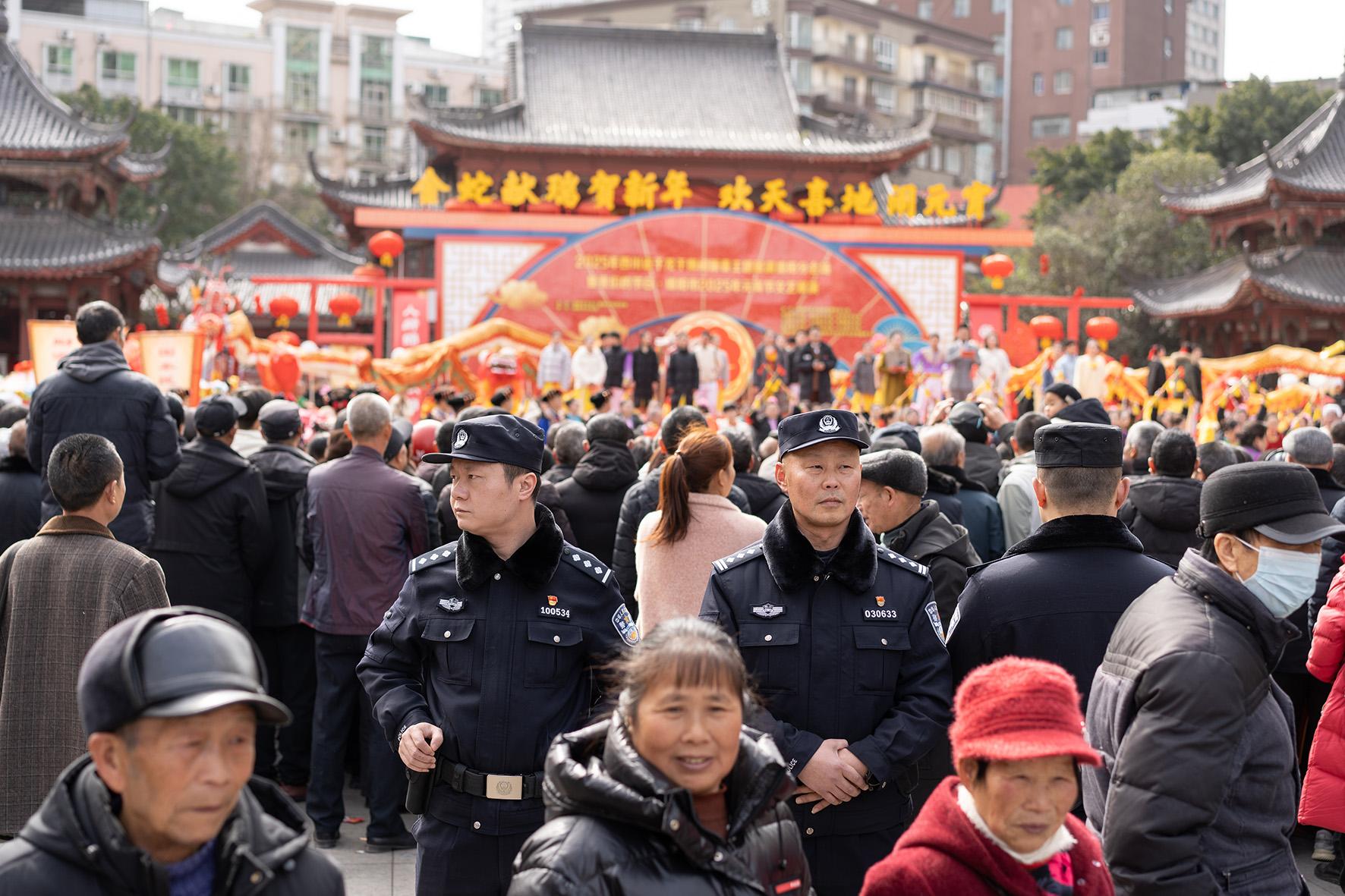 2月12日,四川省綿陽市公安局特巡警支隊民警聯(lián)合涪城分局民警及社會保安力量在鐵牛廣場民俗活動現(xiàn)場值守。