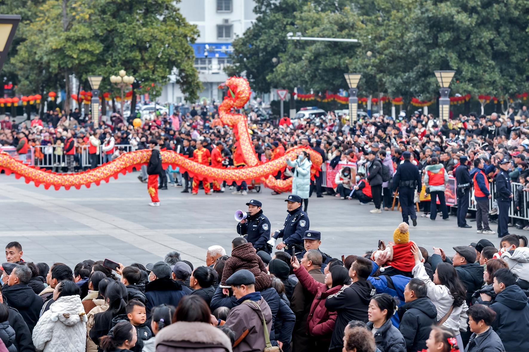 2月11日,安徽省涇縣舉辦“2025鬧元宵·舞龍巡游”活動。為保障活動安全有序進行,涇縣公安局提前謀劃、統(tǒng)籌部署,抽調(diào)200余名警力維護活動秩序。