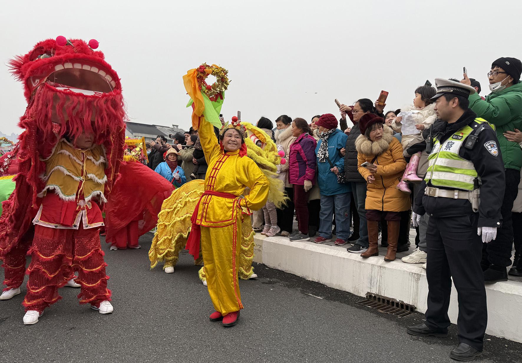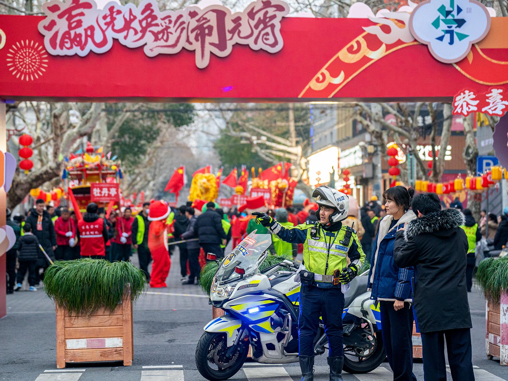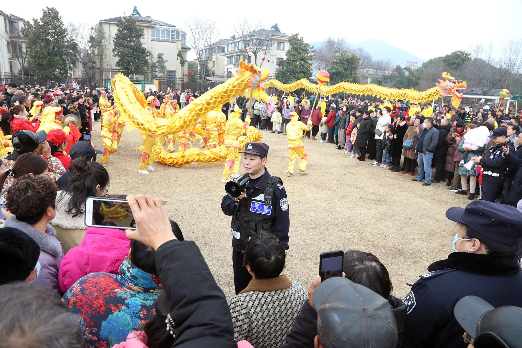 2月12日,江蘇省宜興市公安局湖?派出所民警在“龍騰獅舞鬧元宵”主題民俗文化活動現(xiàn)場維持秩序。