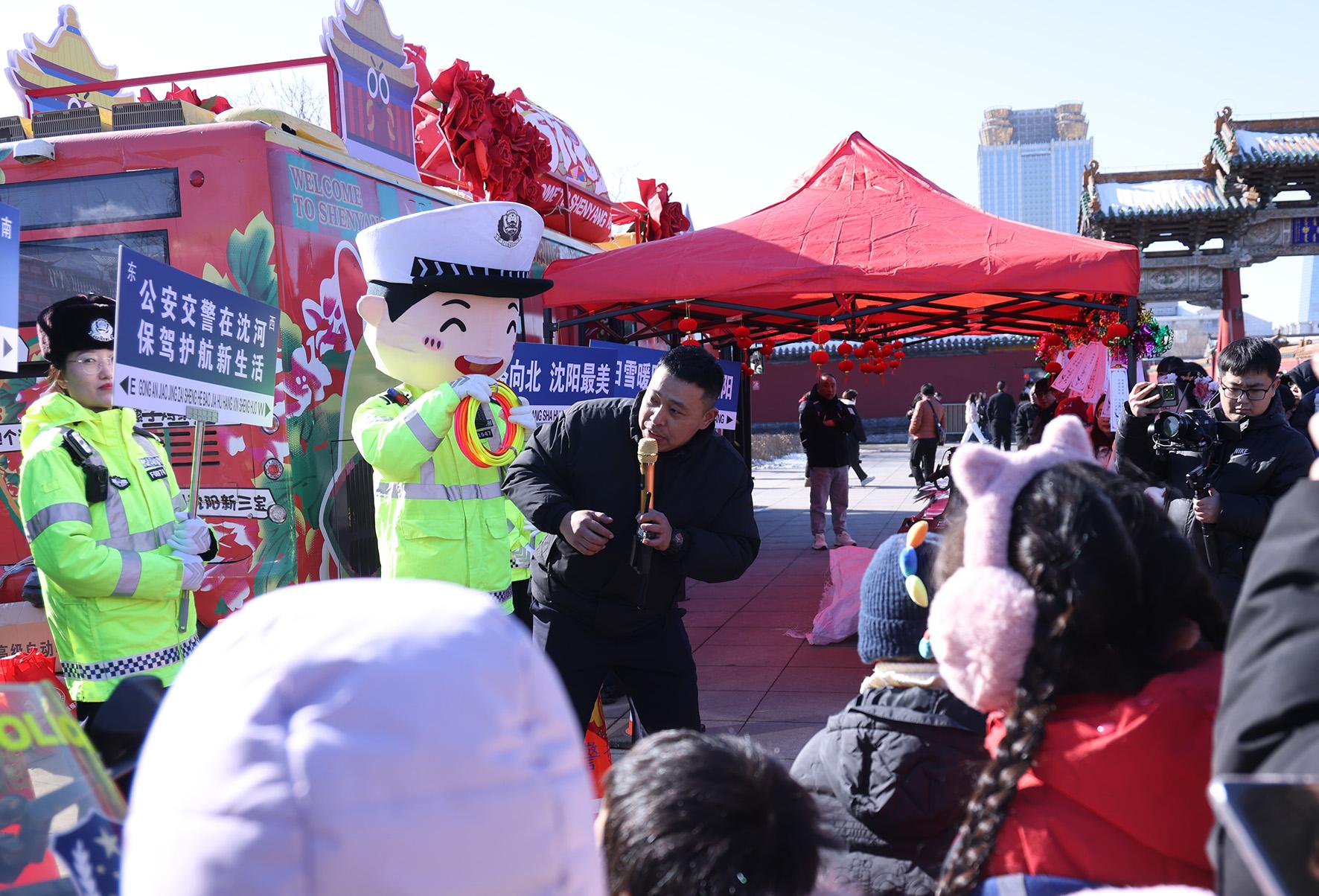 2月12日,遼寧省沈陽市公安局交通警察局沈河大隊交警在沈陽故宮門前開展“猜燈謎 送安全”活動。