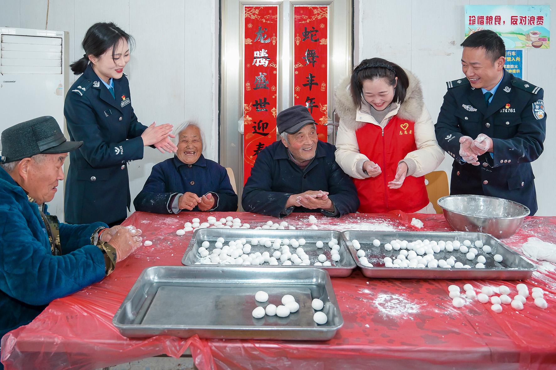 2月11日,在安徽省馬鞍山市和縣石楊鎮(zhèn)敬老院內(nèi),石楊鎮(zhèn)派出所民警與老人們一起搓湯圓,喜迎元宵佳節(jié)。