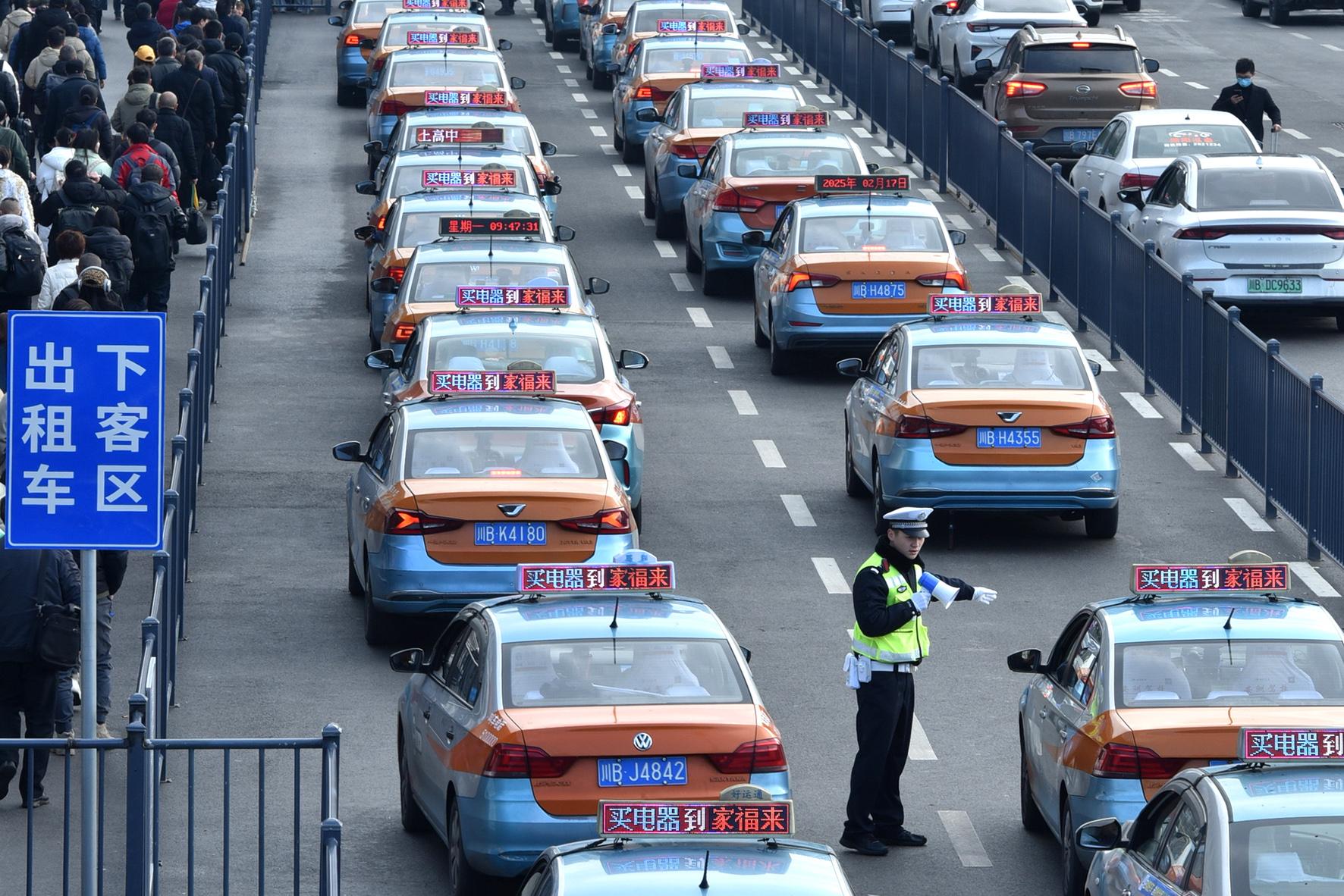 圖為2月17日,民輔警在火車站廣場(chǎng)外指揮疏導(dǎo)行人和車輛。