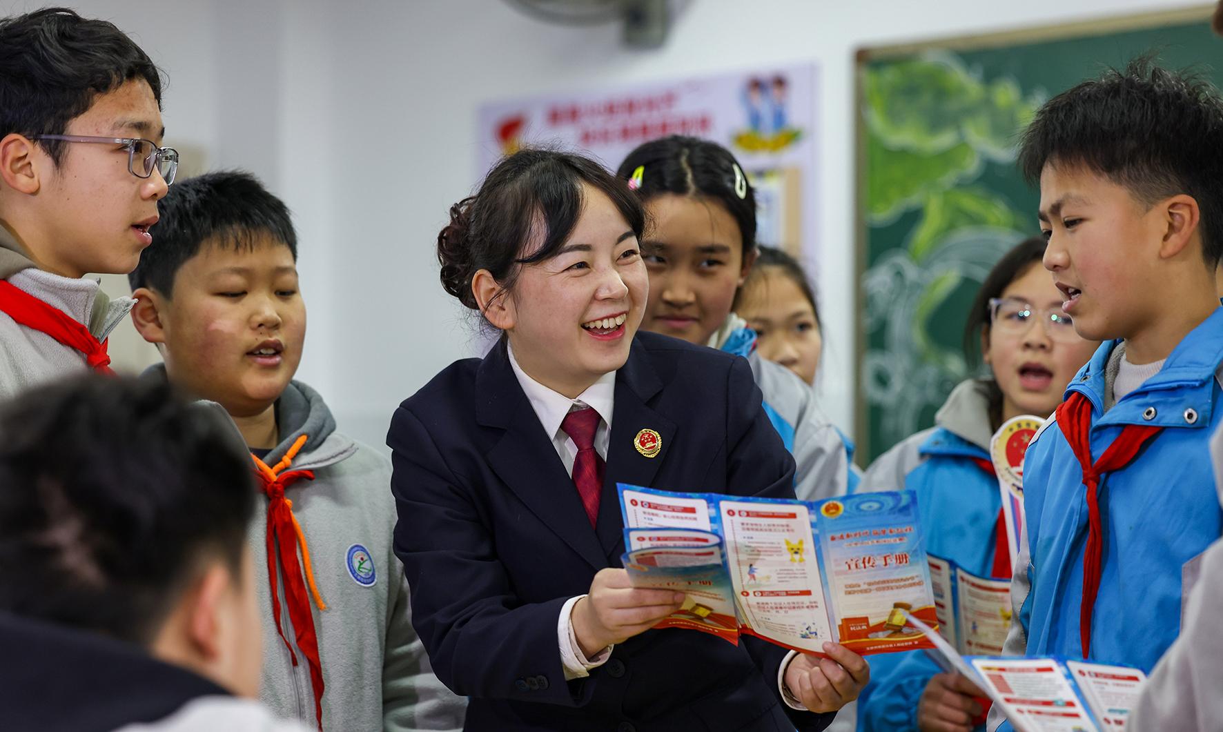 2月17日,在貴州省銅仁市玉屏侗族自治縣第四小學,檢察干警給學生講解法律知識。