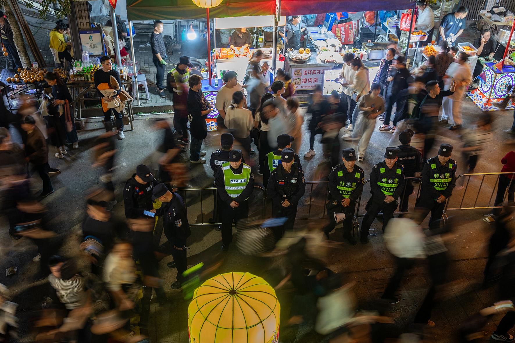 3月2日夜晚,浙江省臺(tái)州市黃巖分局民輔警在寧溪鎮(zhèn)“二月二”非遺燈會(huì)活動(dòng)現(xiàn)場執(zhí)勤守護(hù)。