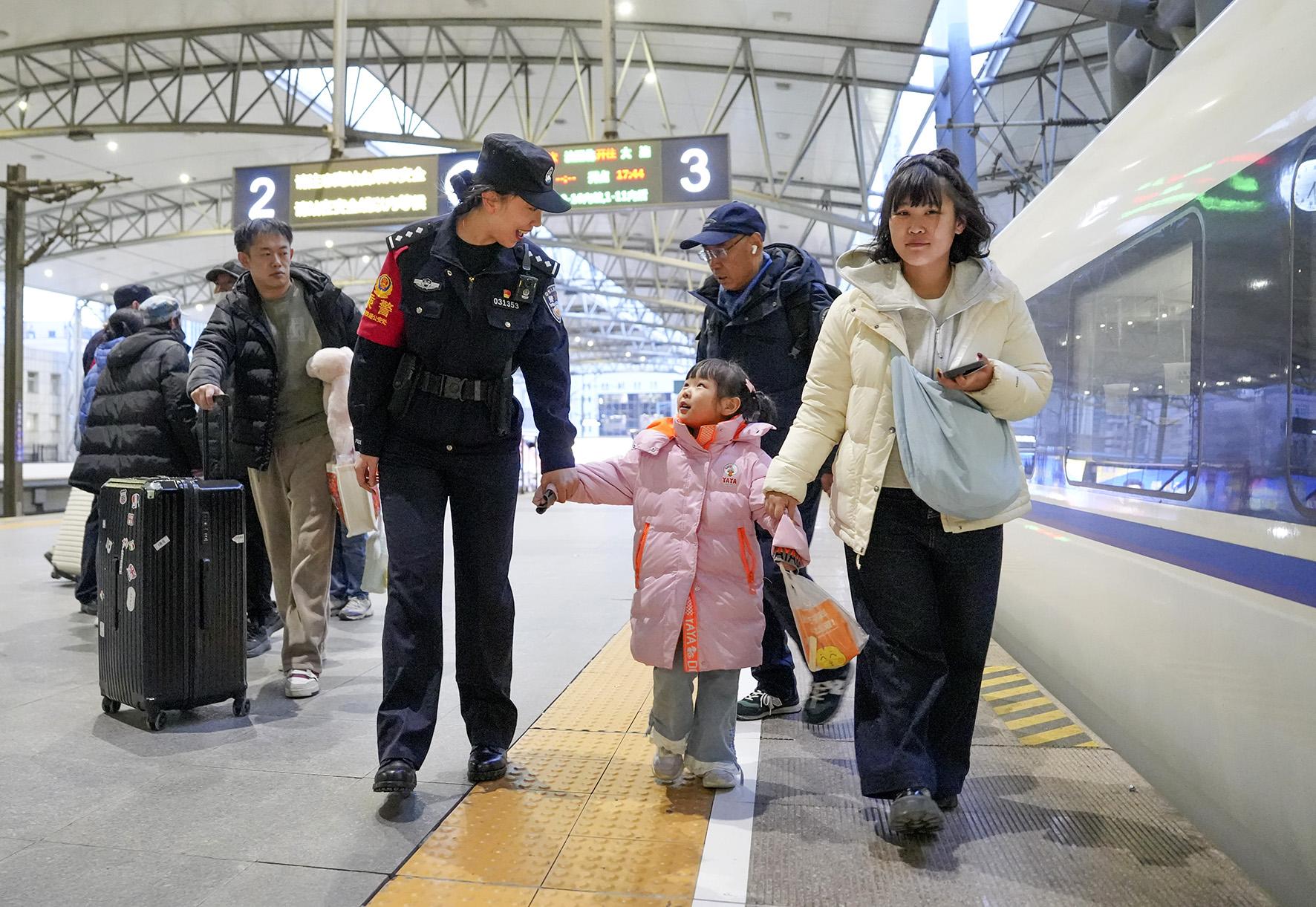 3月7日,沈陽鐵路公安處乘警支隊女子乘務大隊民警用心用情為旅客出行保駕護航,在崗位上迎接“三八”國際婦女節(jié)的到來。