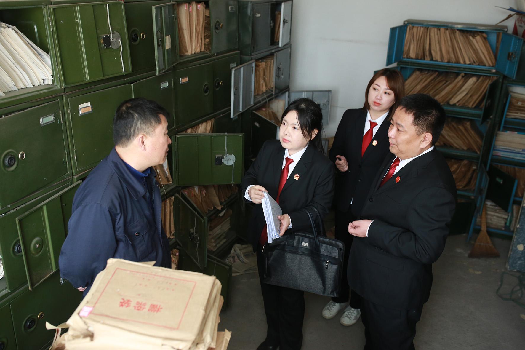 圖為3月31日,法官在審理特殊工種職工申請(qǐng)?zhí)崆巴诵莅讣r(shí),到企業(yè)查閱職工檔案,調(diào)查證據(jù)。