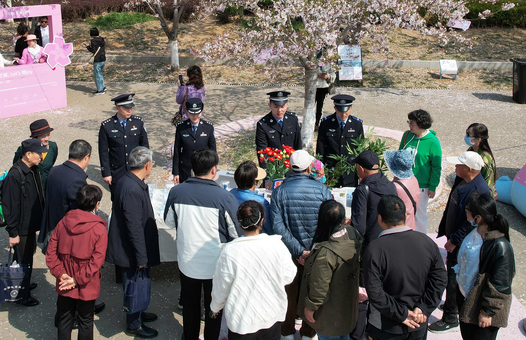 4月9日,山東省煙臺市公安局牟平分局禁毒大隊民警在龍湖櫻花大道通過實物講解、發(fā)放傳單等形式,向市民和游客宣傳禁毒知識。