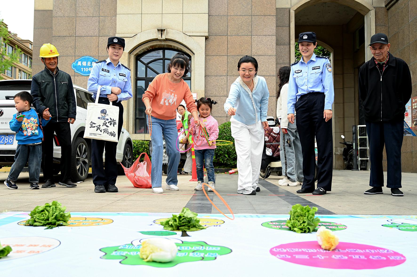 圖為群眾在印有“詐騙套路”的地墊上進(jìn)行有獎(jiǎng)套圈活動(dòng)。