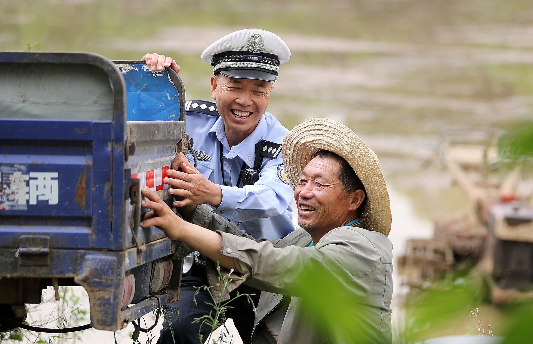 圖為5月6日,民警在麻城鎮(zhèn)丁店村給農(nóng)用車粘貼反光條,以提高農(nóng)用車的安全性。