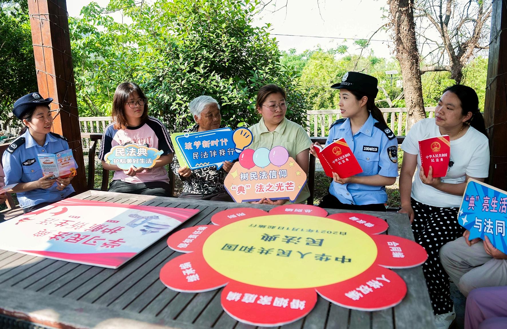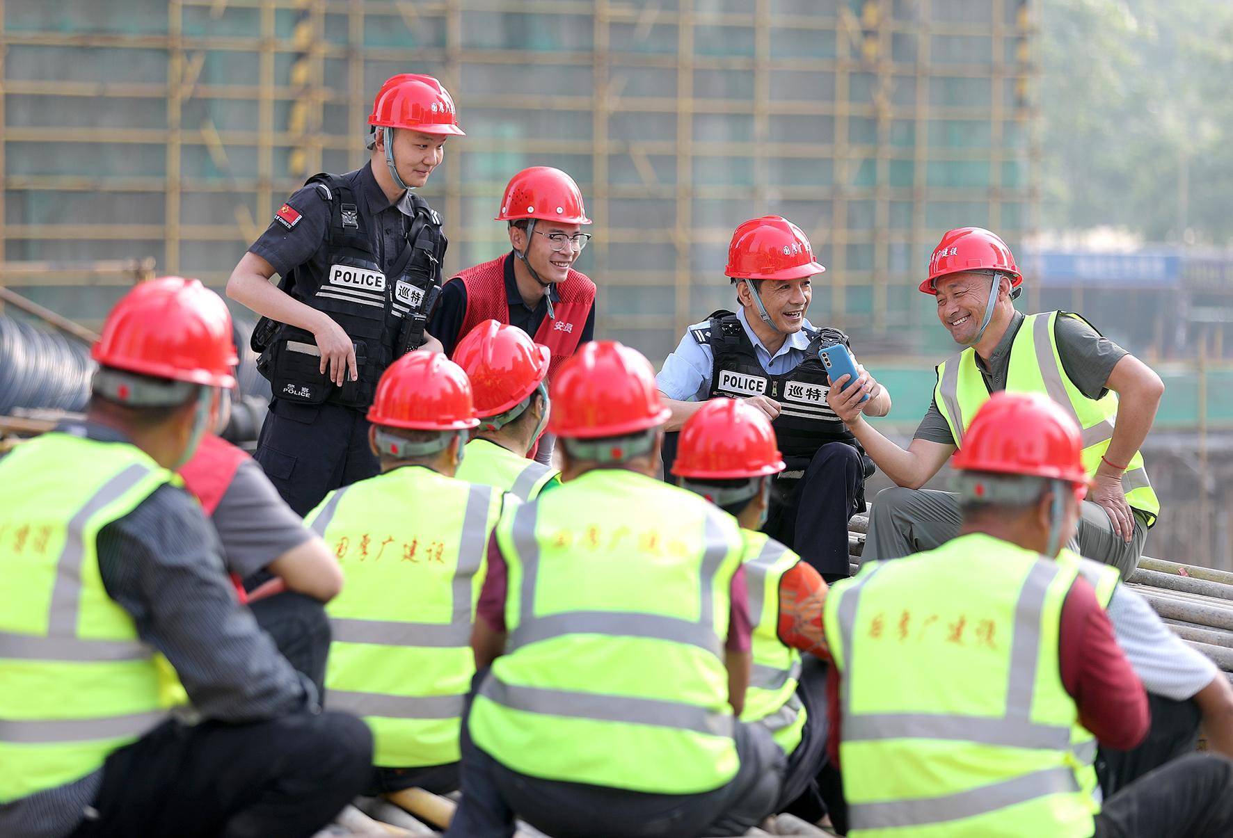 5月20日,在湖北省荊門市漳河新區(qū)一處建筑工地,荊門市公安局巡特警支隊生態(tài)運動公園警務站民警利用“班前會”,向工友們普及民法典相關知識。