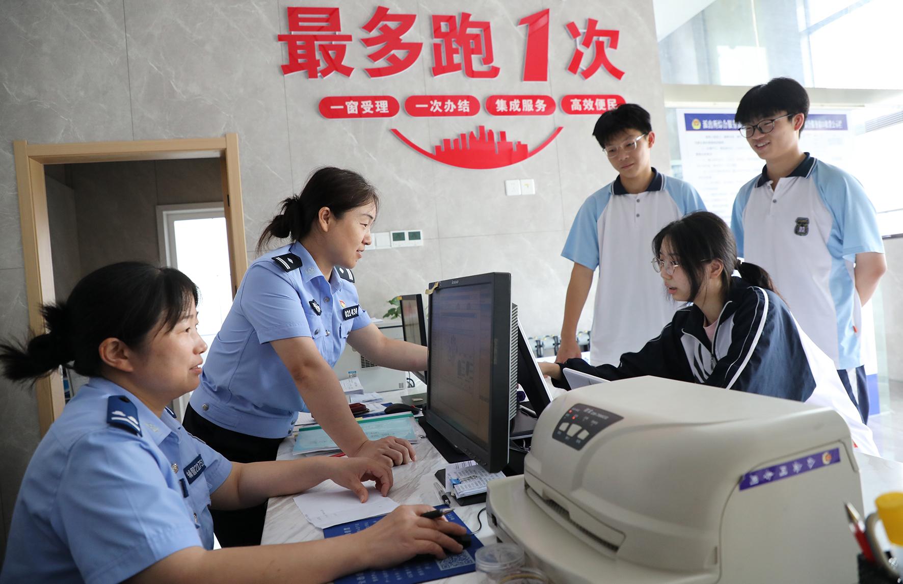 5月20日,江西省九江市公安局濂溪分局劉家塘派出所為考生開設辦證“綠色通道”,戶籍窗口民警周末和午休時間一律在崗,采取延時、錯時、預約等方式為學生辦證提供24小時服務。