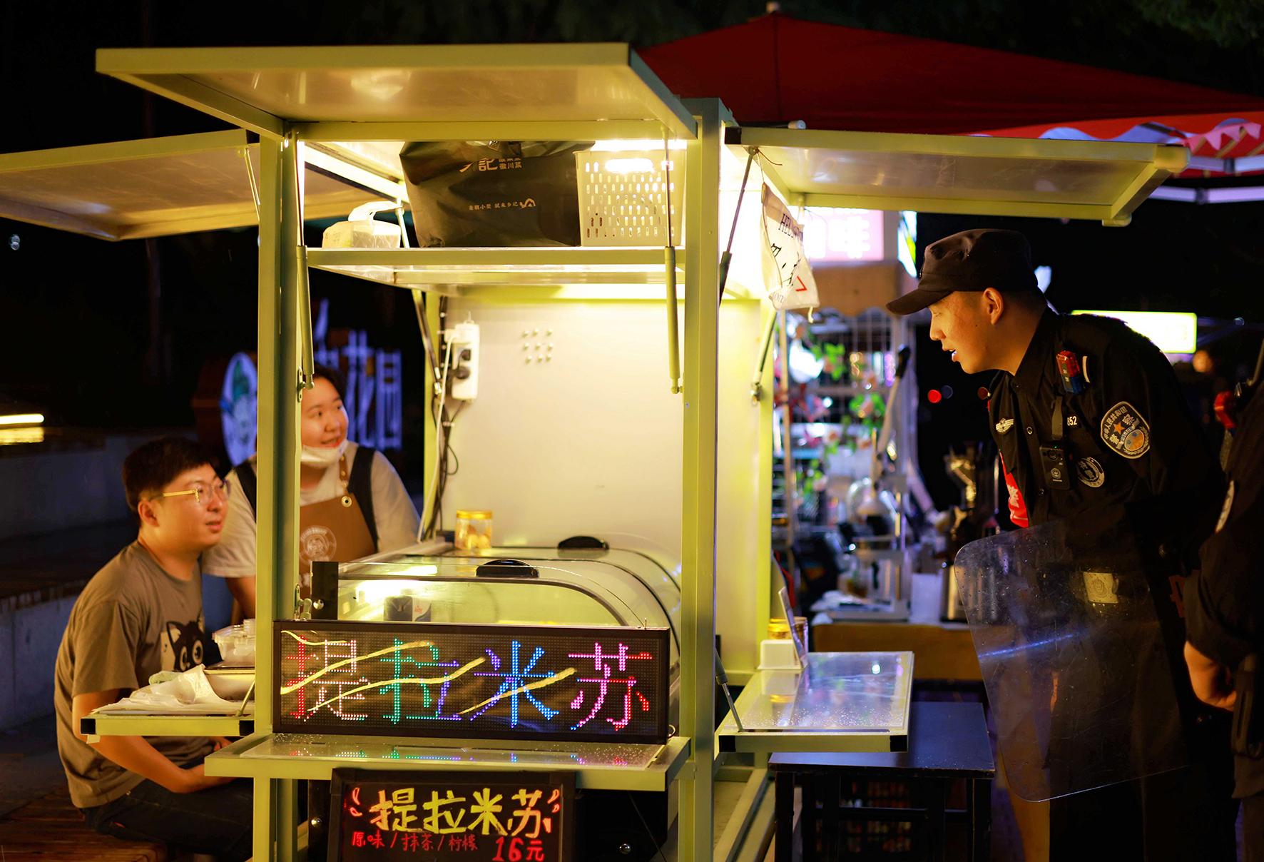 5月22日晚,安徽省馬鞍山市公安局特警支隊(duì)軍民路警務(wù)站民警輔警在軍民路小吃一條街開(kāi)展巡邏和安全提醒。