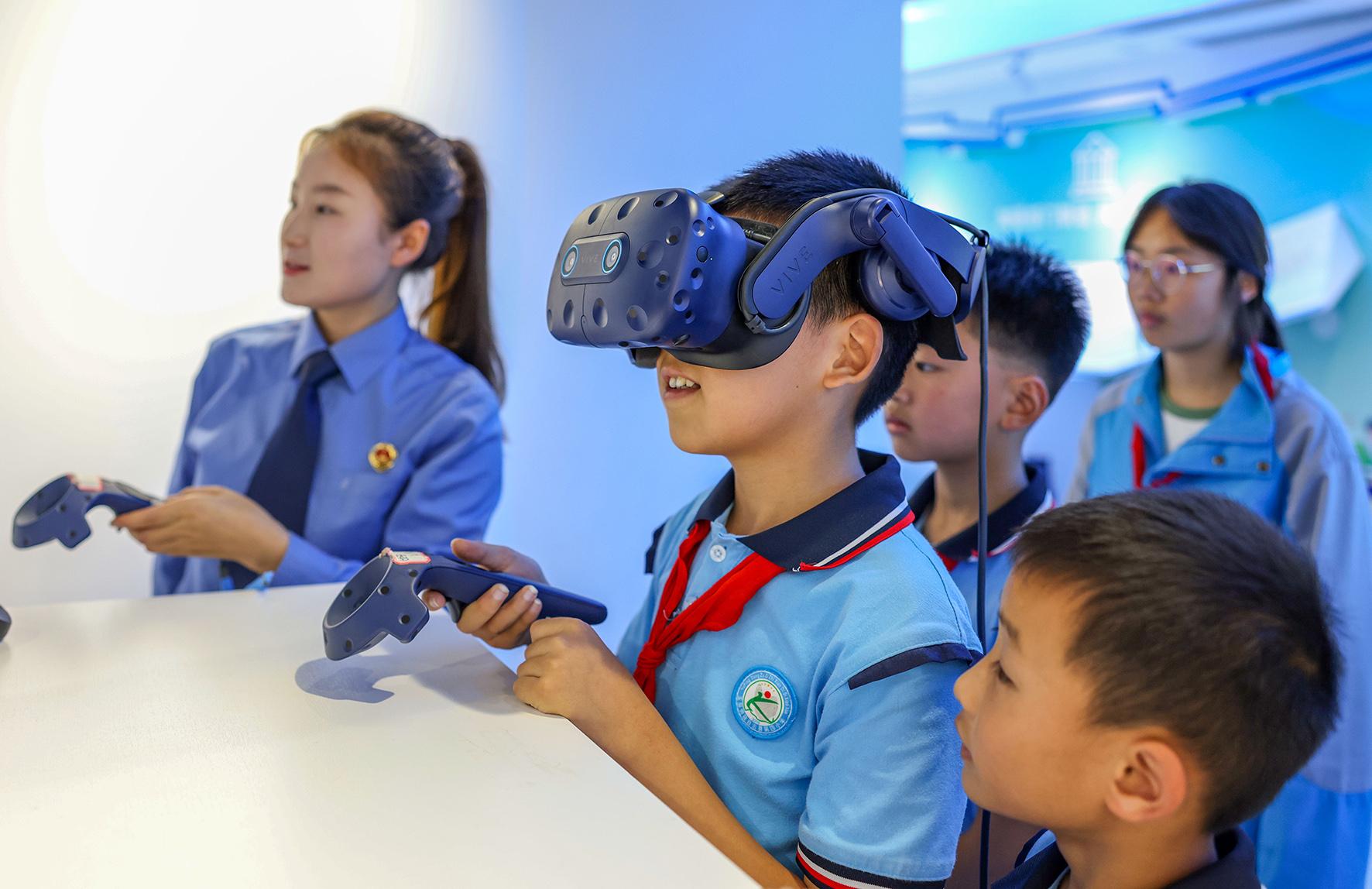 5月28日,在貴州省銅仁市玉屏侗族自治縣人民檢察院青少年法治教育基地,學(xué)生們利用VR眼鏡學(xué)習(xí)法律知識。