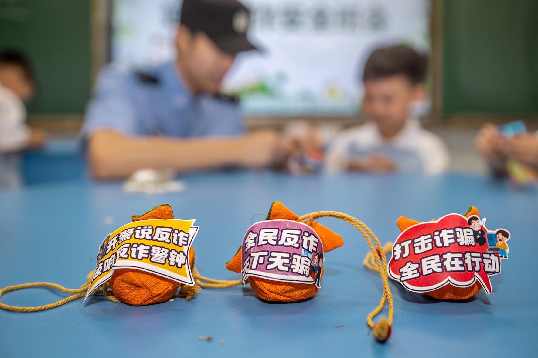 5月28日,浙江省武義縣公安局熟溪派出所民警來到轄區(qū)棲霞小學(xué),與同學(xué)們一起動(dòng)手制作“反詐香囊”。