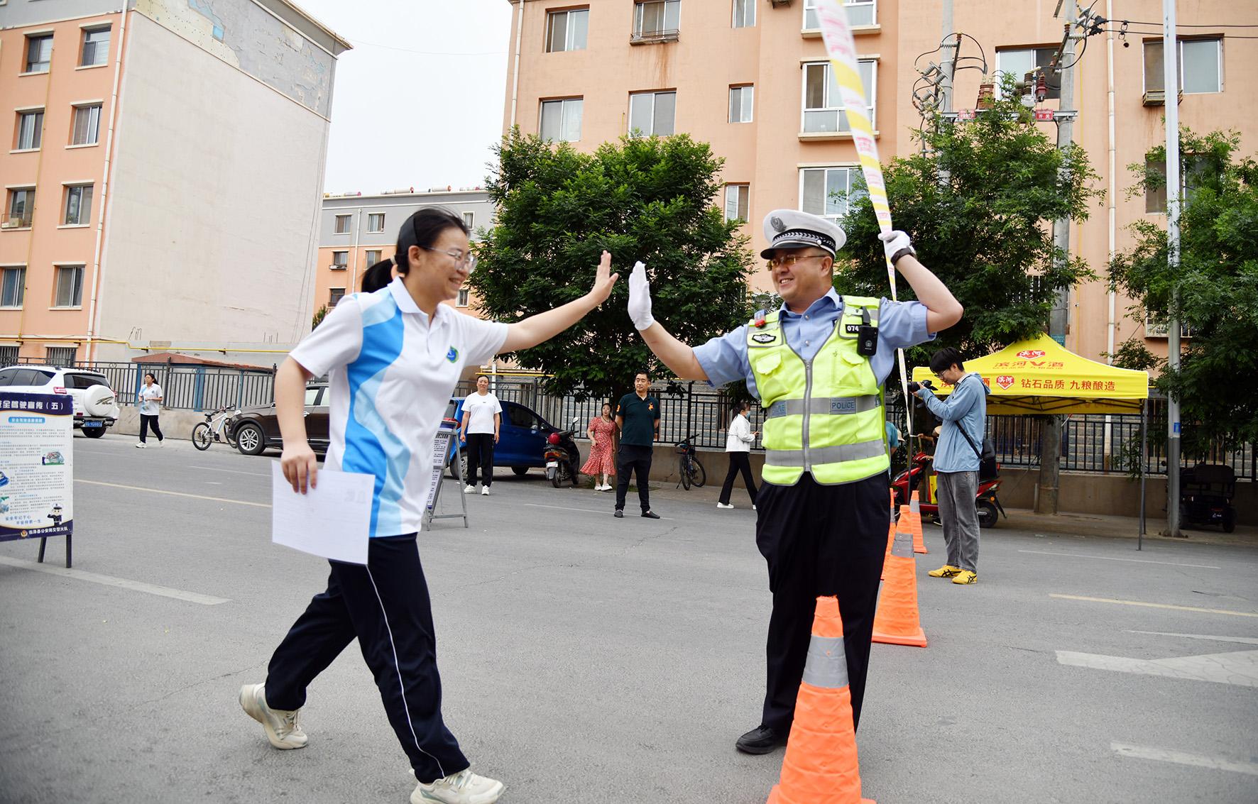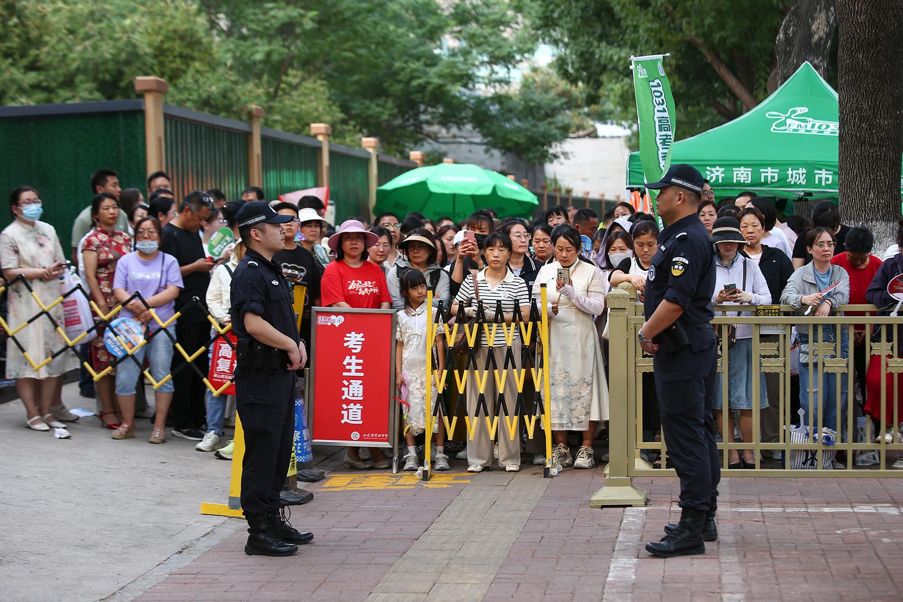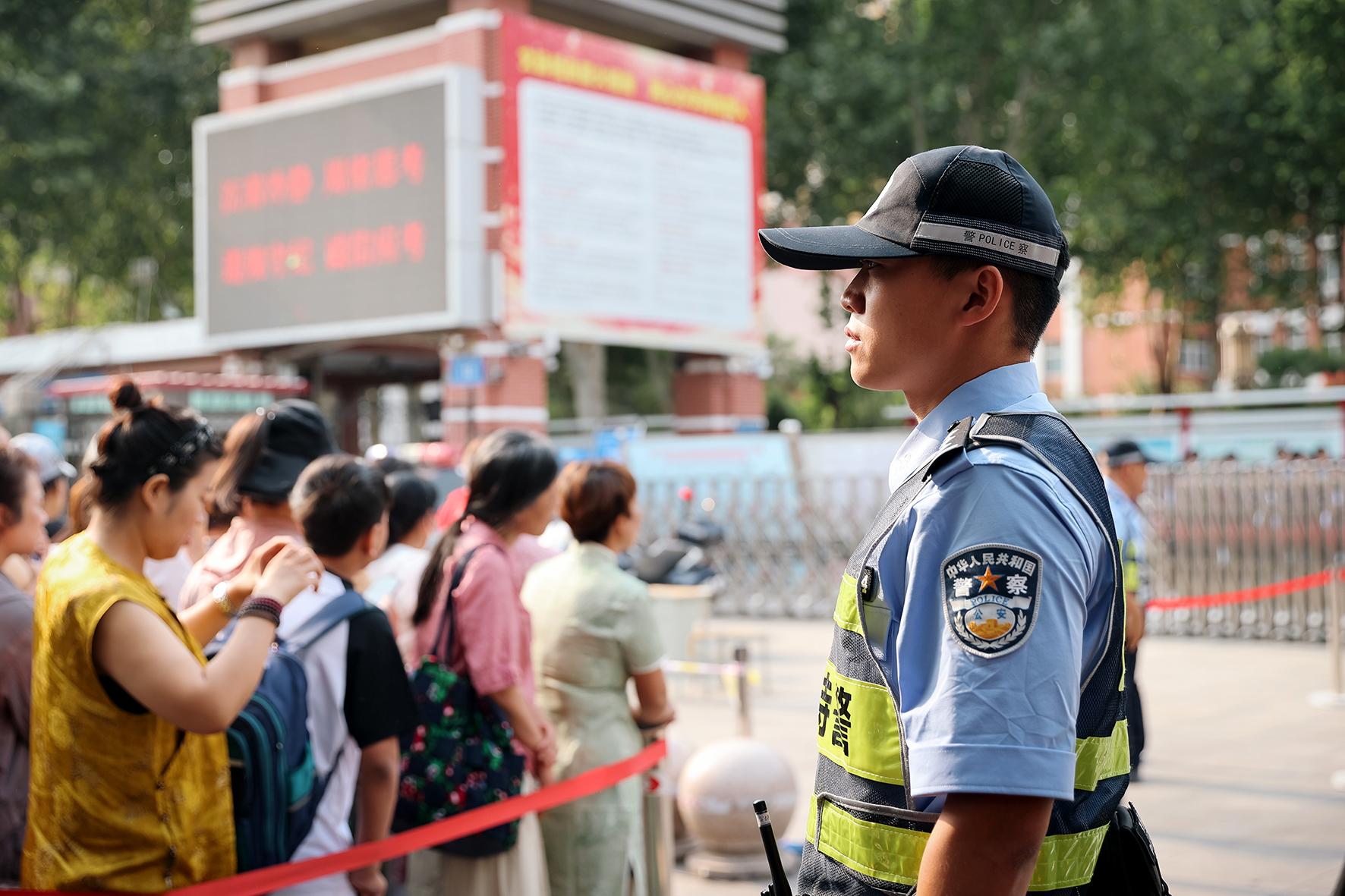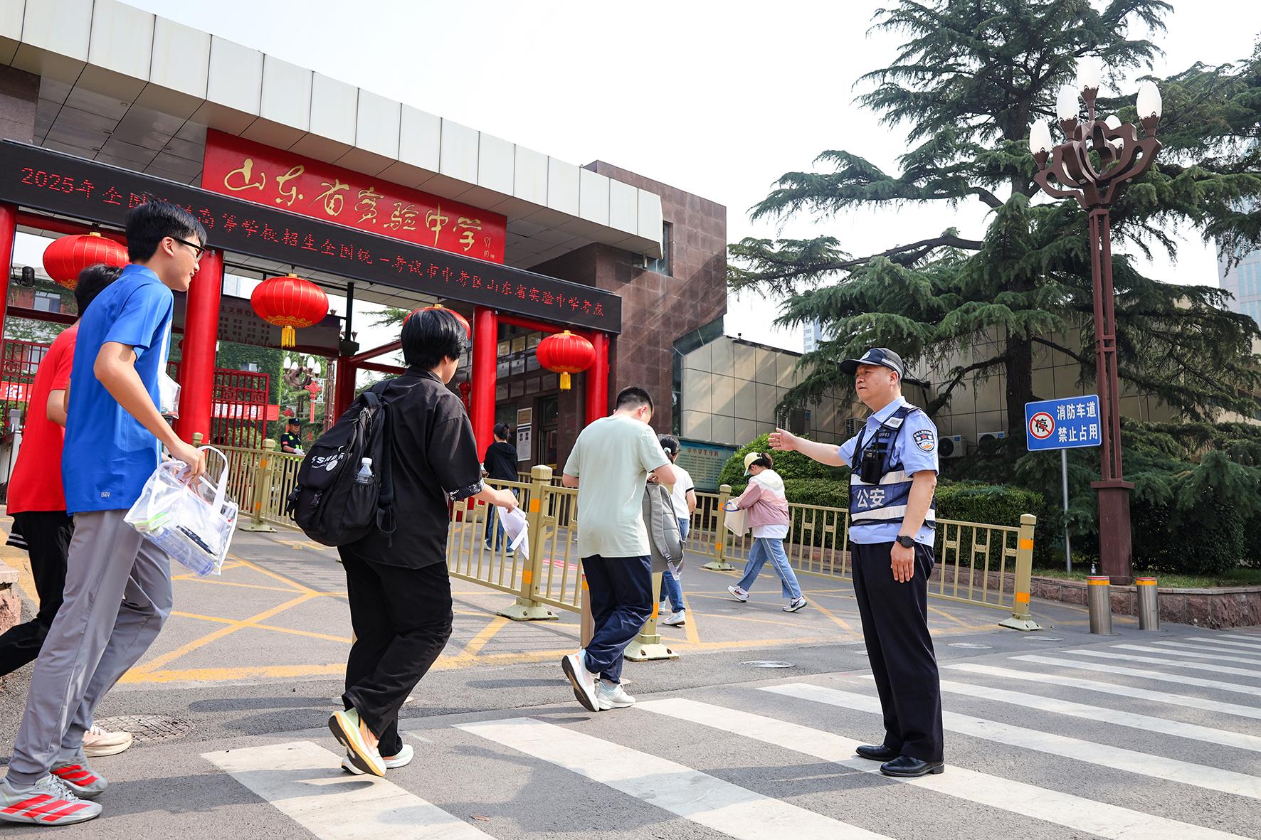 6月7日,在山東省實驗中學(xué)考點,濟(jì)南市公安局市中區(qū)分局桿石橋派出所執(zhí)勤民警引導(dǎo)考生有序進(jìn)場。