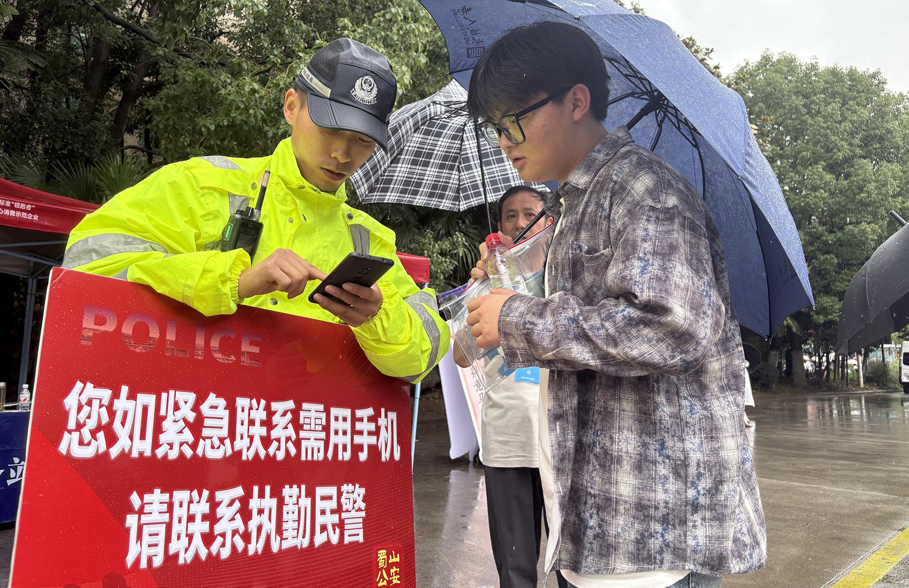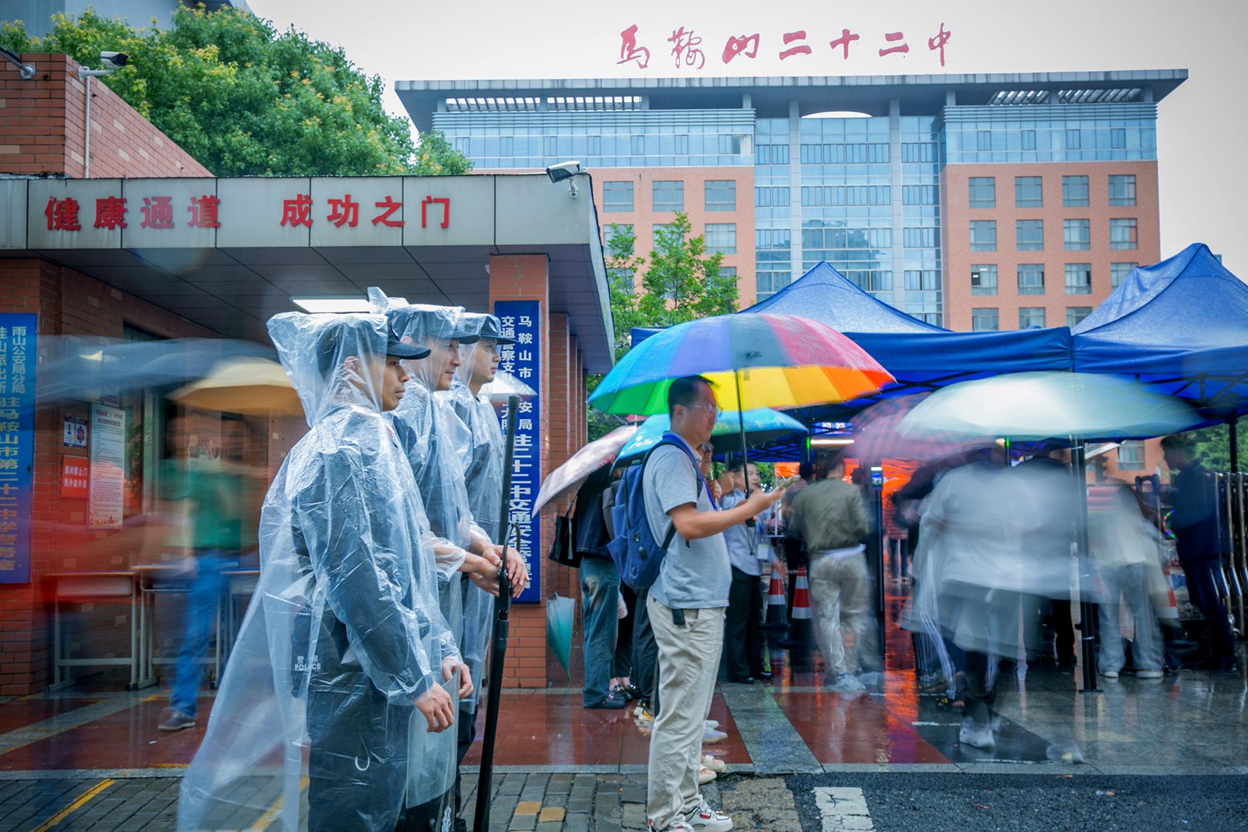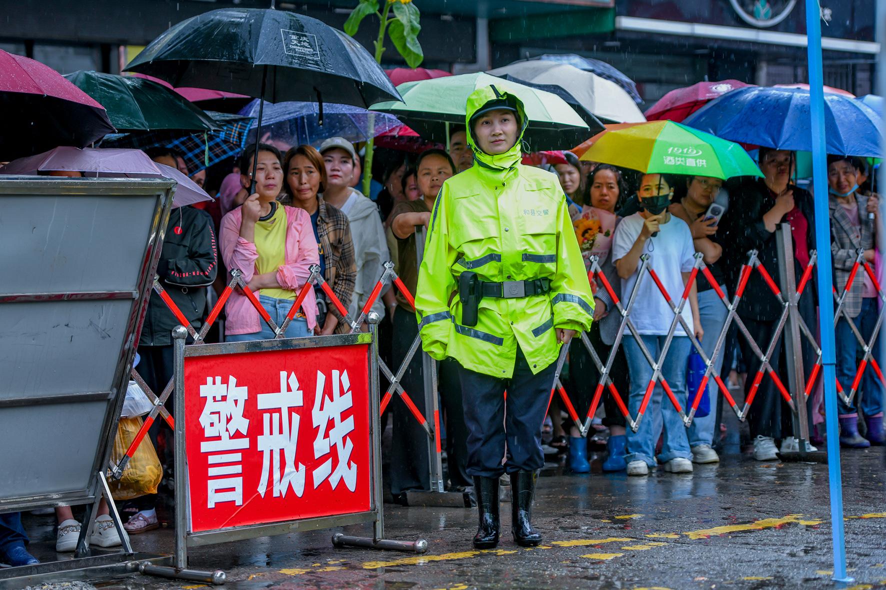 6月7日,安徽省馬鞍山市公安局雨山分局民警在考點外頂風(fēng)冒雨,全力維護(hù)考點周邊秩序。