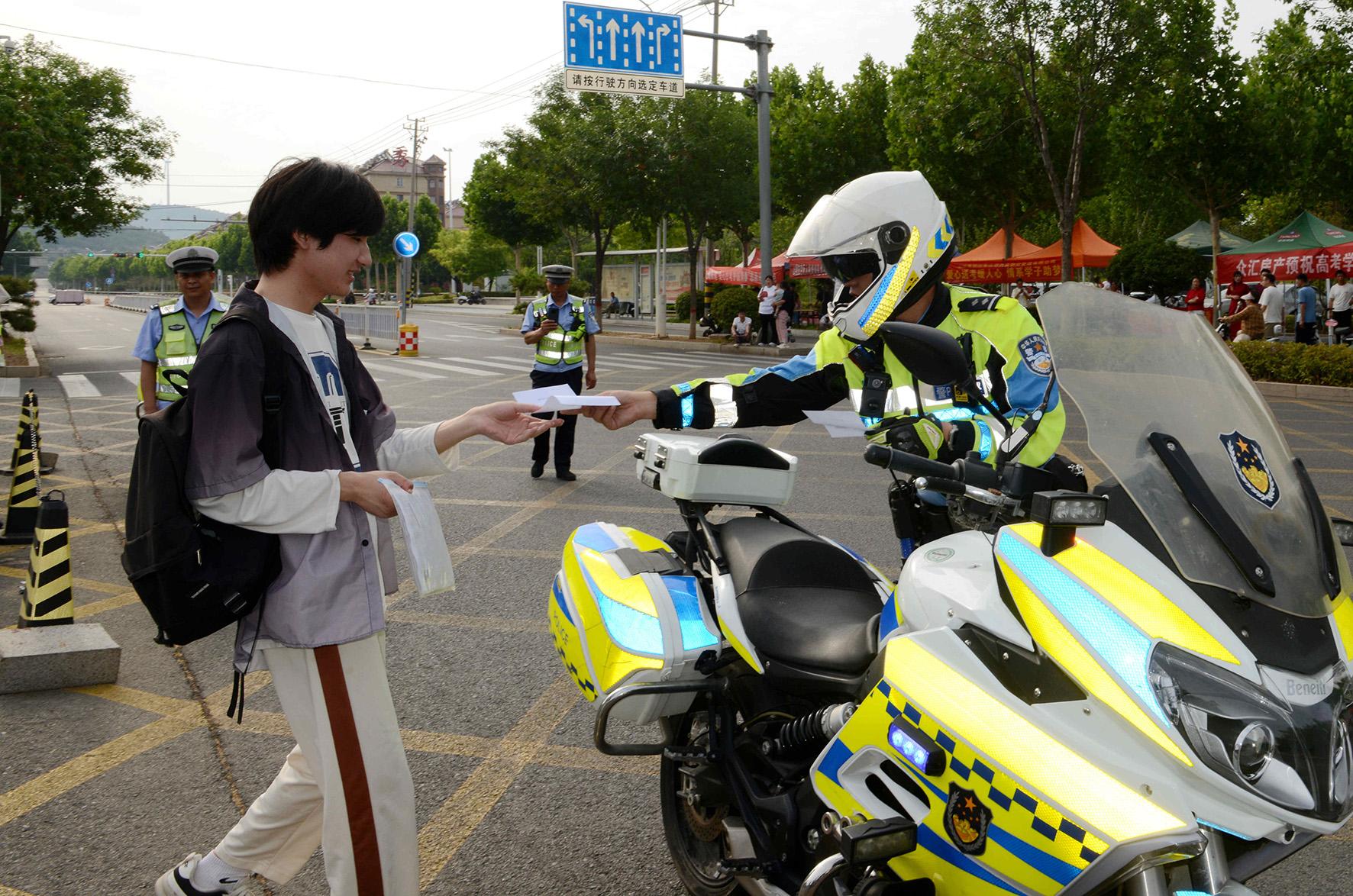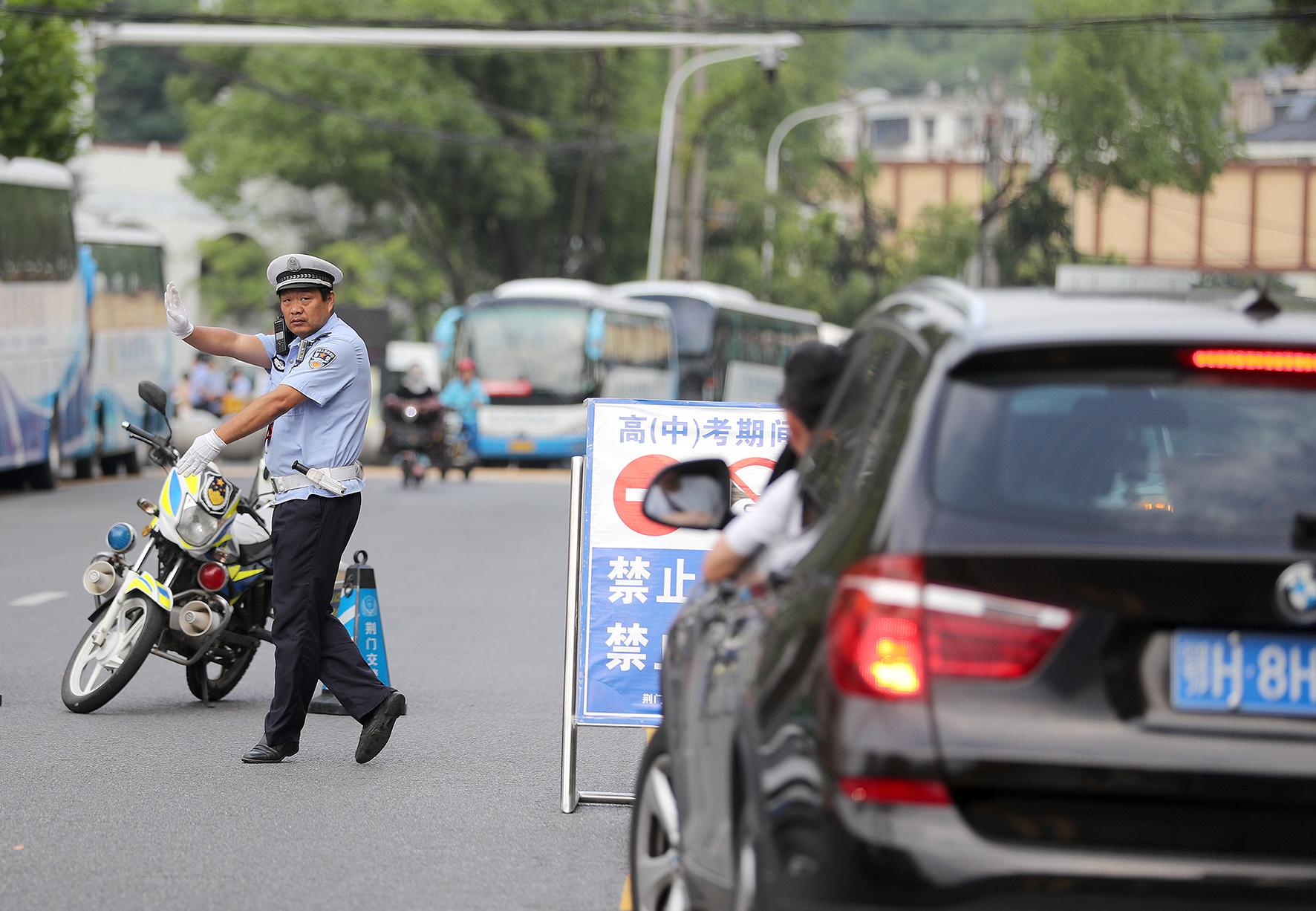 6月7日,在湖北省荊門市龍泉中學(xué)高考考點,荊門市公安局交警支隊民警在疏導(dǎo)送考車輛。