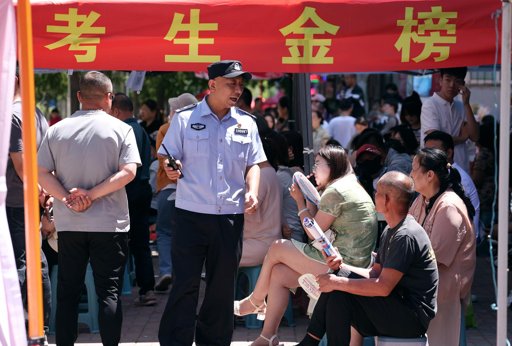 6月7日,遼寧省沈陽市公安局沈北分局新城子街派出所民警為考生家長提供服務(wù)。