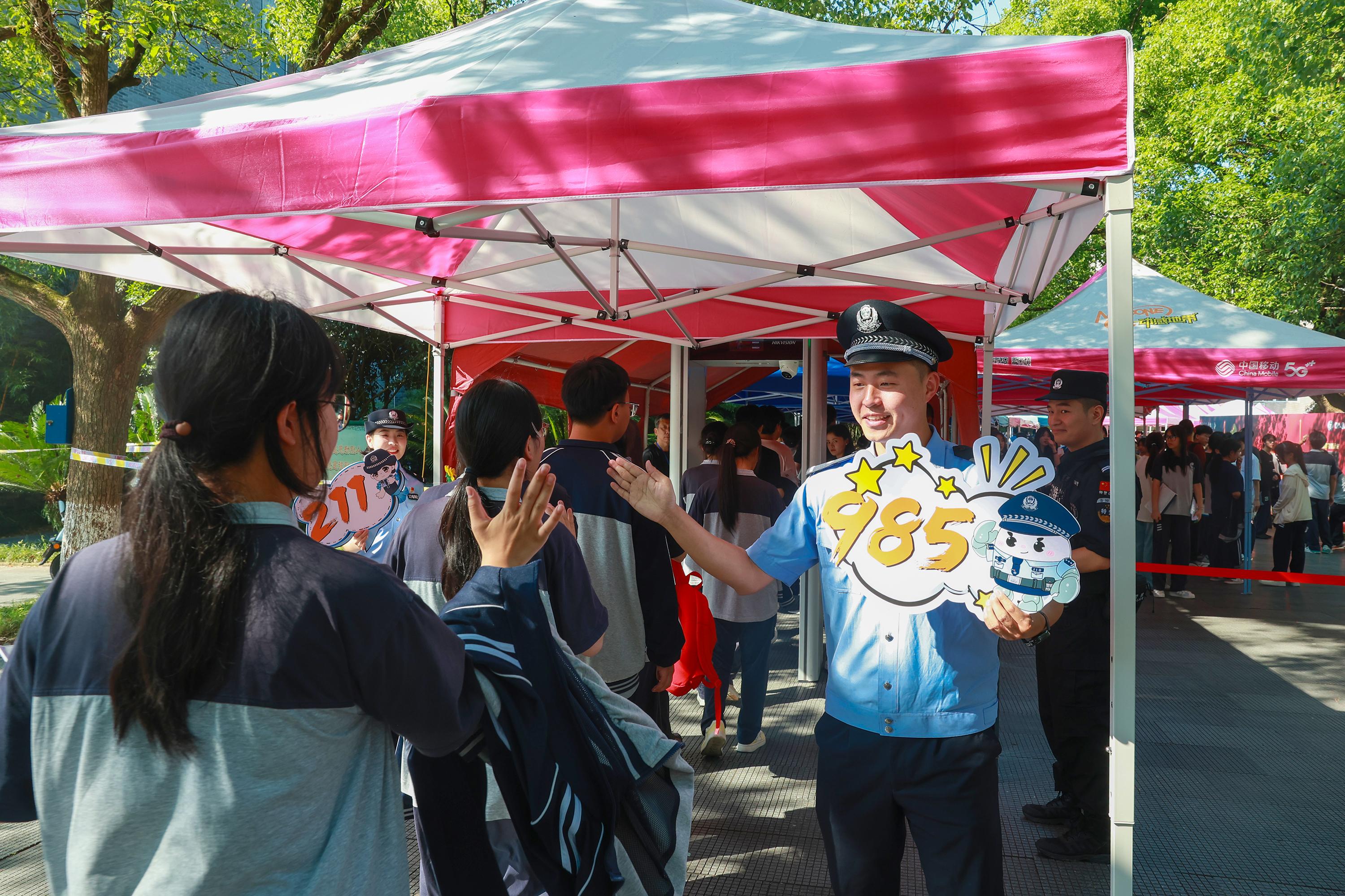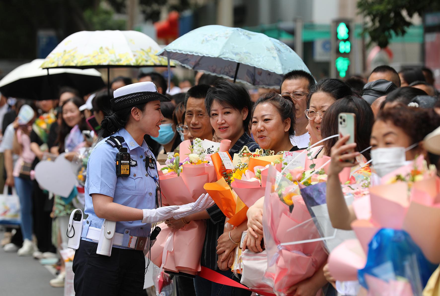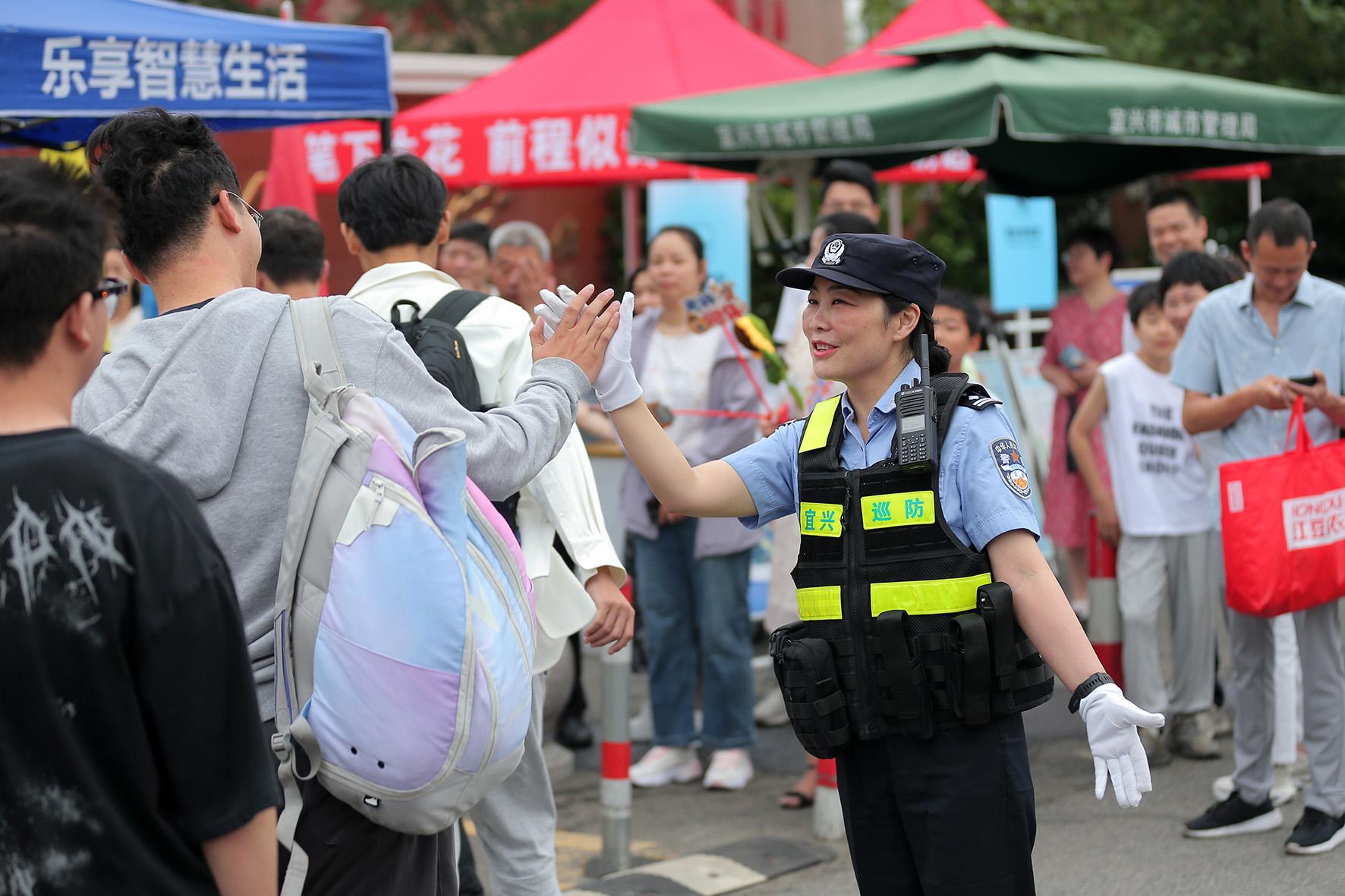 6月7日,江蘇省宜興市公安局環(huán)科園派出所社區(qū)民警在宜興市第二高級中學(xué)考點為考生護(hù)航加油。