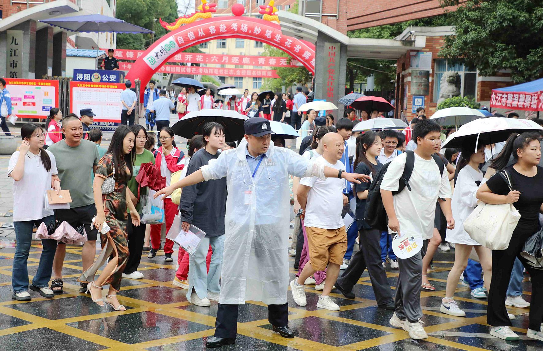 6月8日,江西省九江市公安局潯陽分局民輔警冒雨在九江市三中考點指揮疏導(dǎo)交通。