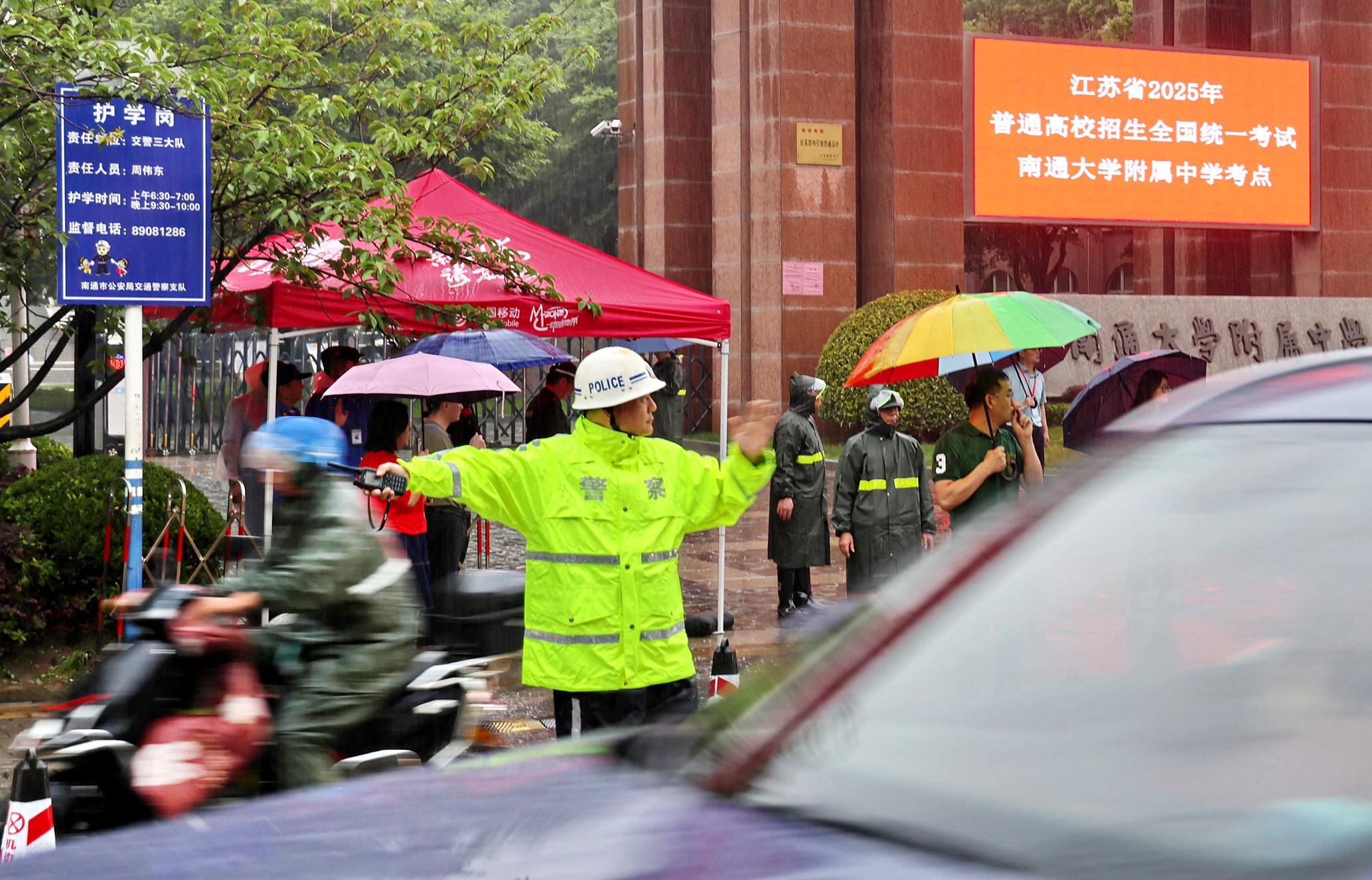 6月7日,江蘇省南通市在雨中迎來高考。南通市公安局民警全警動員,堅守崗位,護(hù)航學(xué)子圓夢。