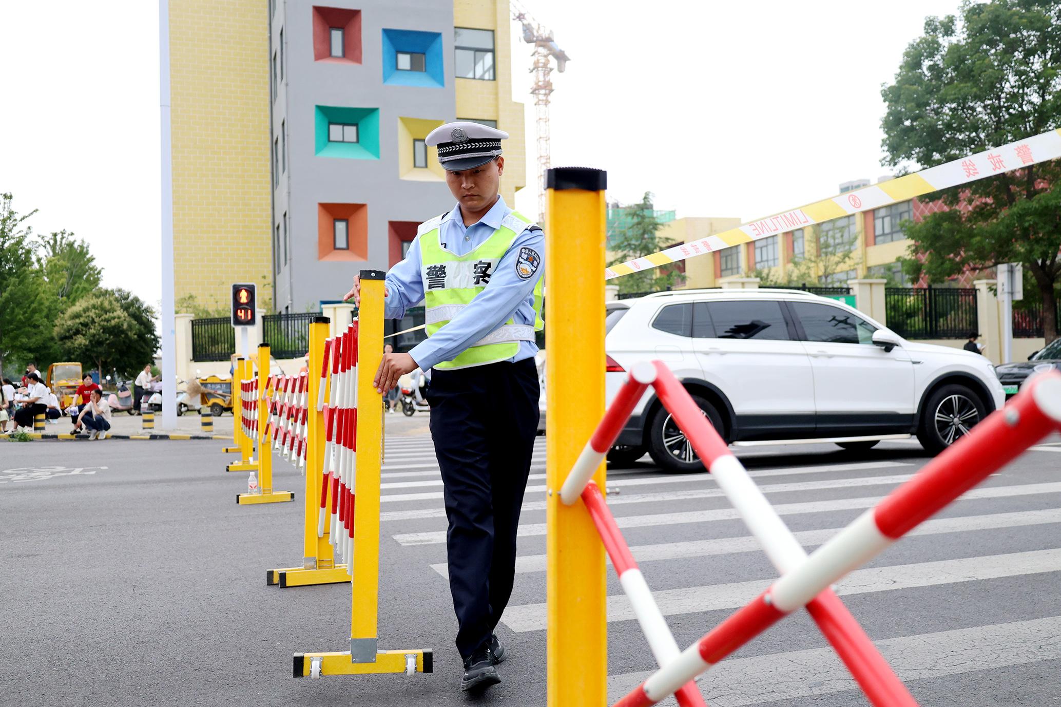 6月7日,安徽省馬鞍山市含山縣公安局民輔警在高考考點路段指揮疏導(dǎo)交通。