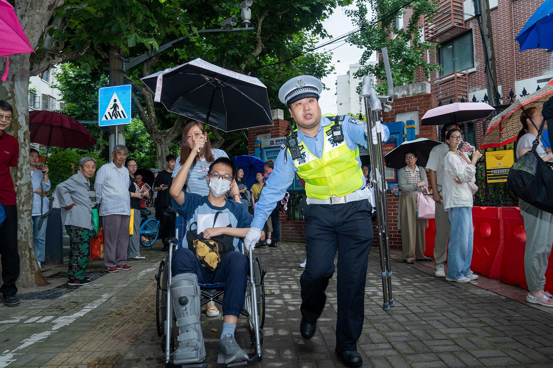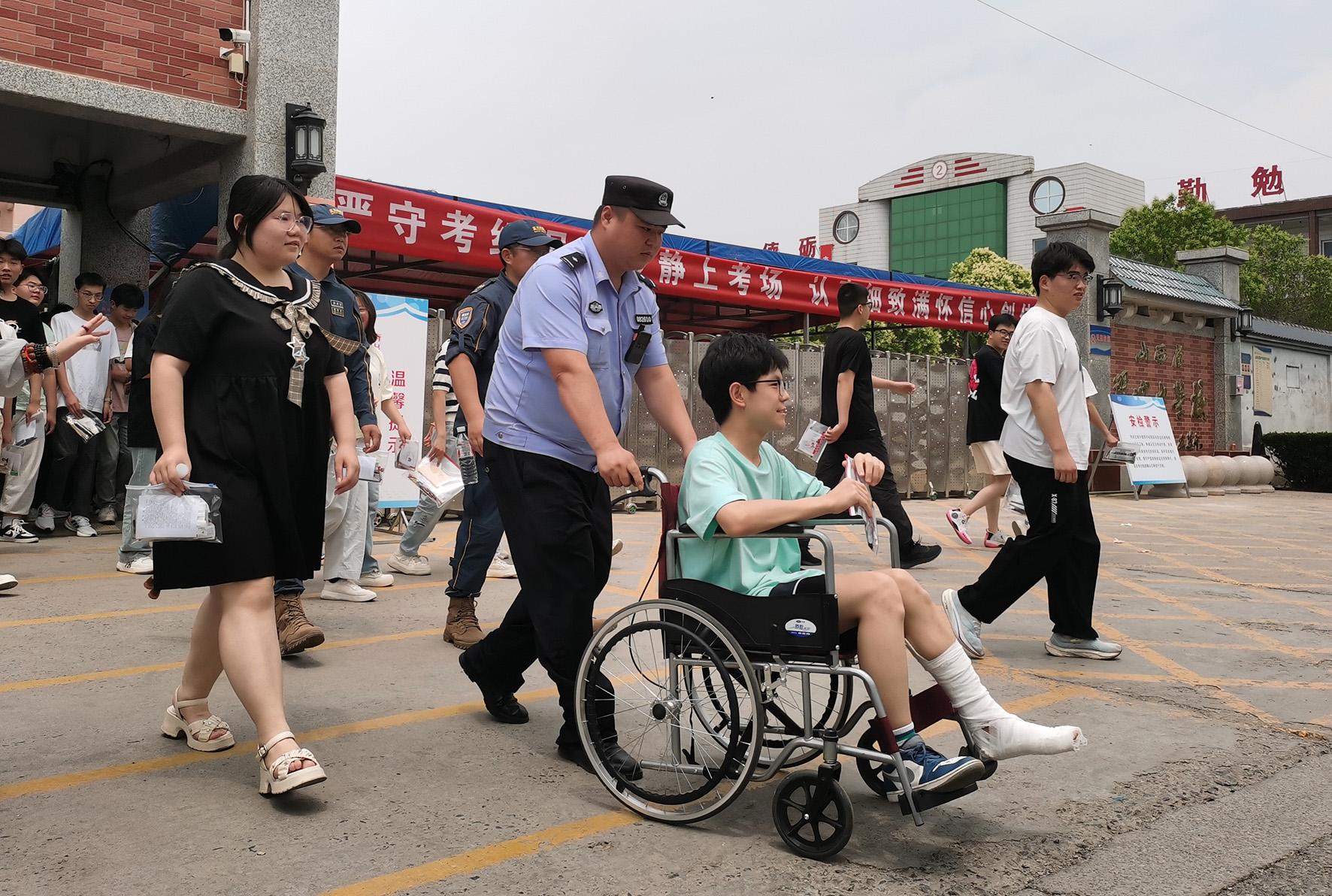 6月7日,陜西省富平縣公安局執(zhí)勤民輔警正在幫助受傷考生進(jìn)入考場。