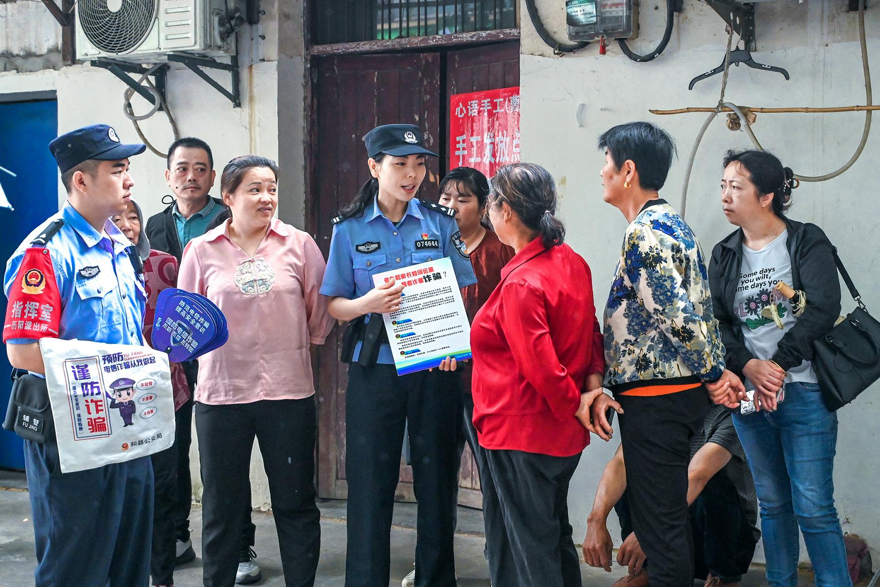 6月9日,安徽省馬鞍山市和縣公安局民警正在向陪考的家長開展預(yù)防高考類詐騙宣傳。