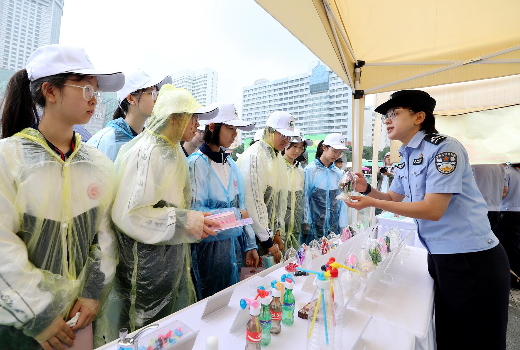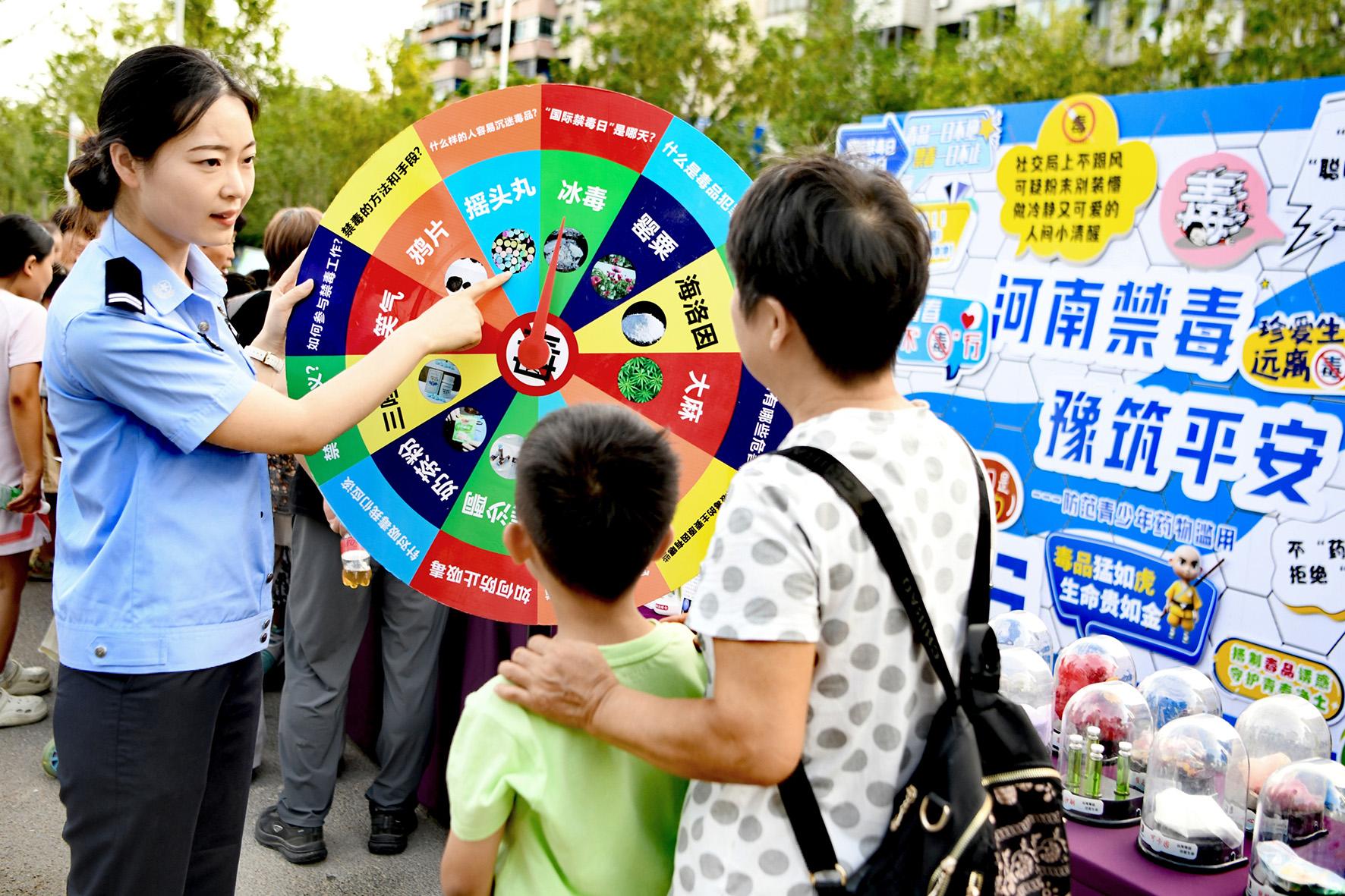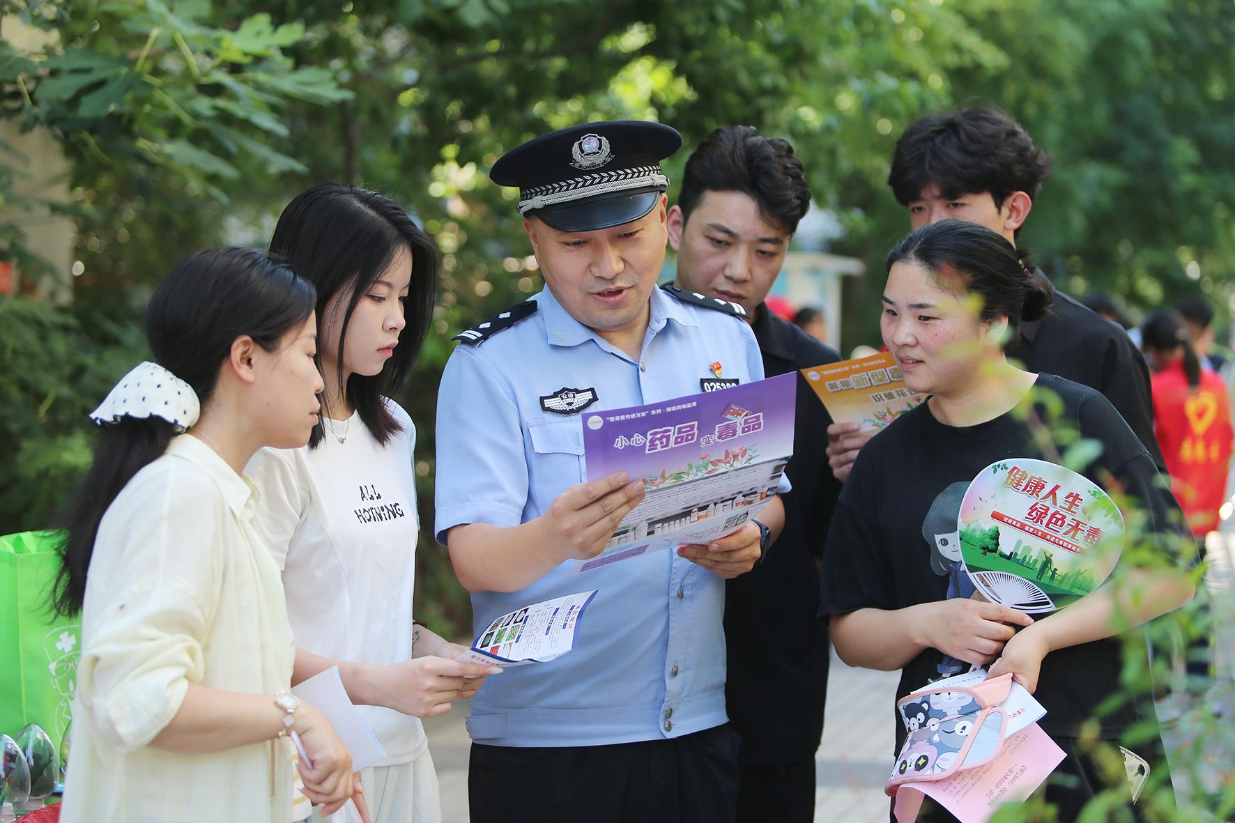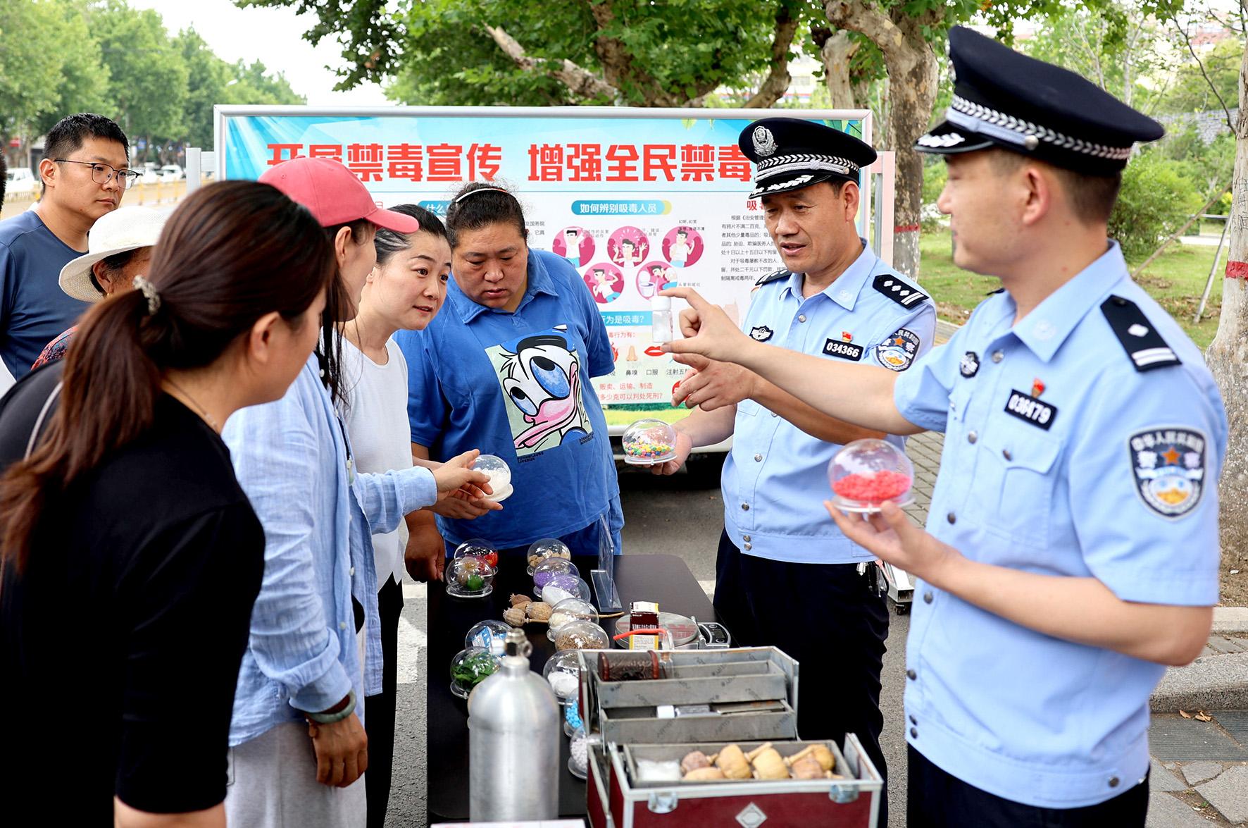 6月24日,河南省鄭州市公安局禁毒支隊(duì)民輔警在青年公園廣場(chǎng)利用仿真毒品模型為市民群眾講解毒品的危害性。