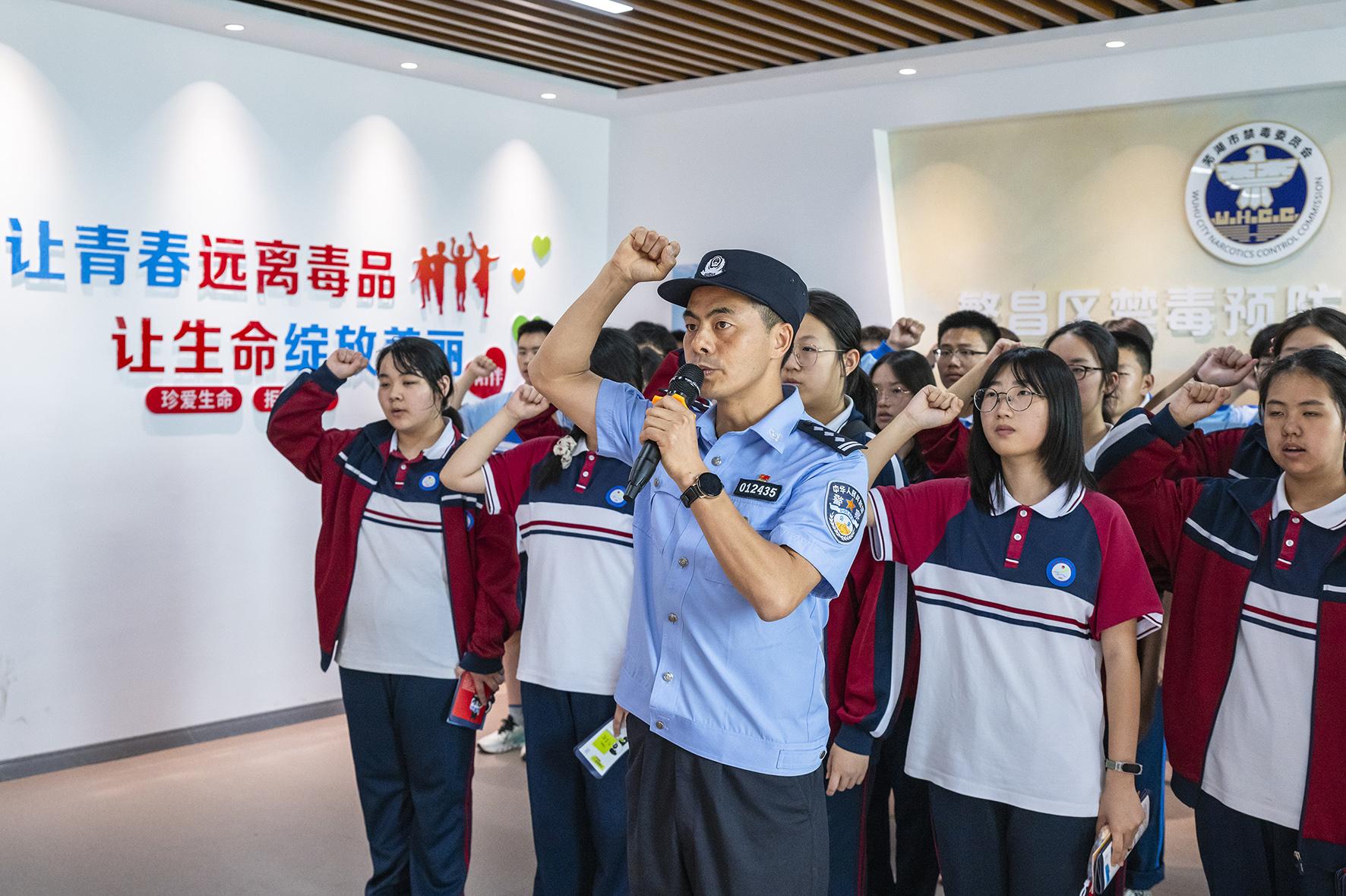 在第38個(gè)國(guó)際禁毒日來(lái)臨之際,6月24日,安徽省蕪湖市公安局繁昌分局民警帶領(lǐng)學(xué)生進(jìn)行禁毒宣誓。