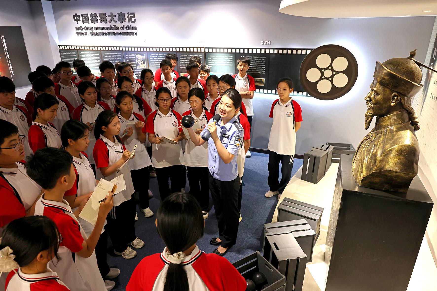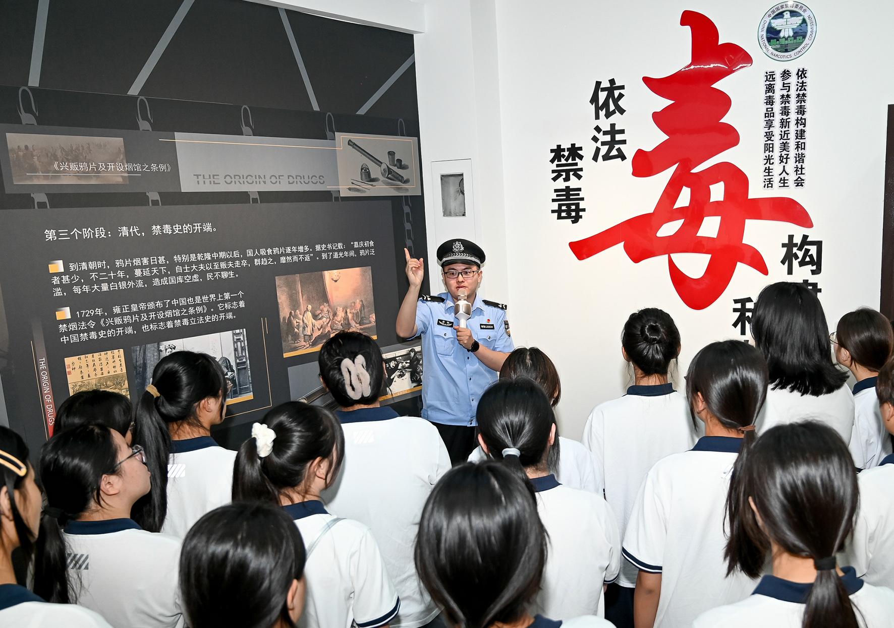 6月24日,在安徽省馬鞍山市和縣禁毒教育基地,講解員正在向和縣科技職業(yè)學(xué)校的學(xué)生講解禁毒知識(shí)。