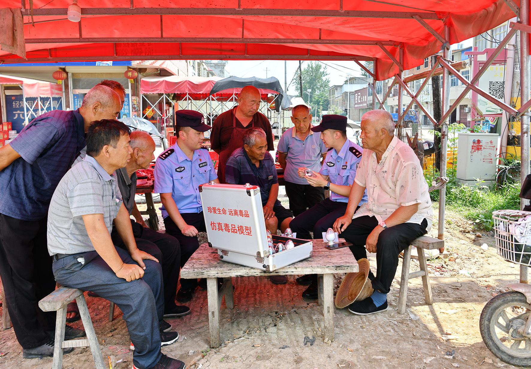 6月24日,安徽省阜南縣公安局禁毒大隊(duì)民警在段郢鄉(xiāng)張小集村頭,利用仿真毒品模型為村民們講解毒品的危害性。
